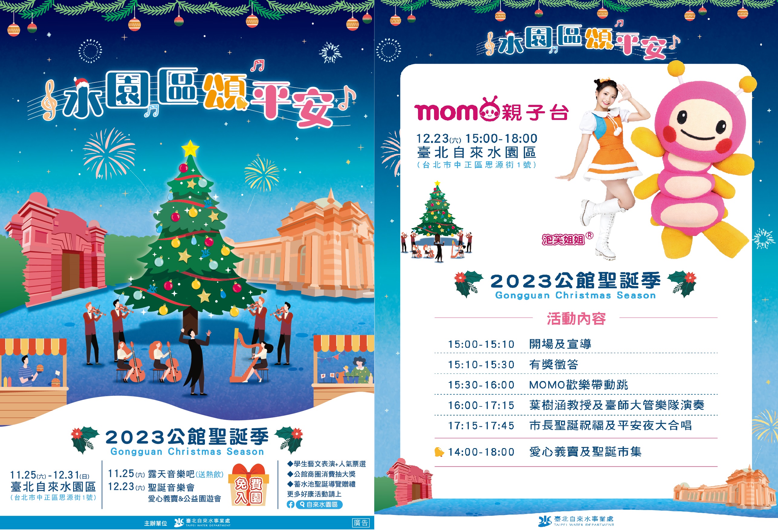 2023公館聖誕季12月23日音樂會免費入園,絕美 燈飾伴隨交響樂、眾人合唱平安夜,還有MOMO親子帶動 唱、愛心義賣市集,當日商圈抽獎送PS5、IPad等好禮,期待與您共度溫暖平安夜,詳情請見自來水園區粉專。