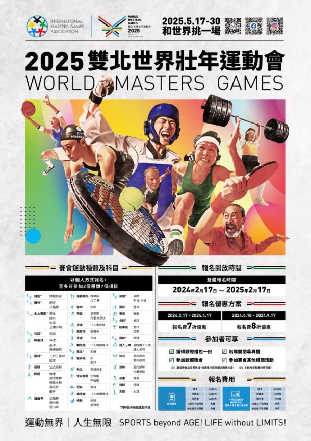 2025雙北世界壯年運動會於2025年5月17至30日 舉行,共有35種運動種類其中包含帕拉運動組別,年 滿30歲無需選拔即可參賽,今年2月17日官網開放報 名,等你一起和世界挑一場!