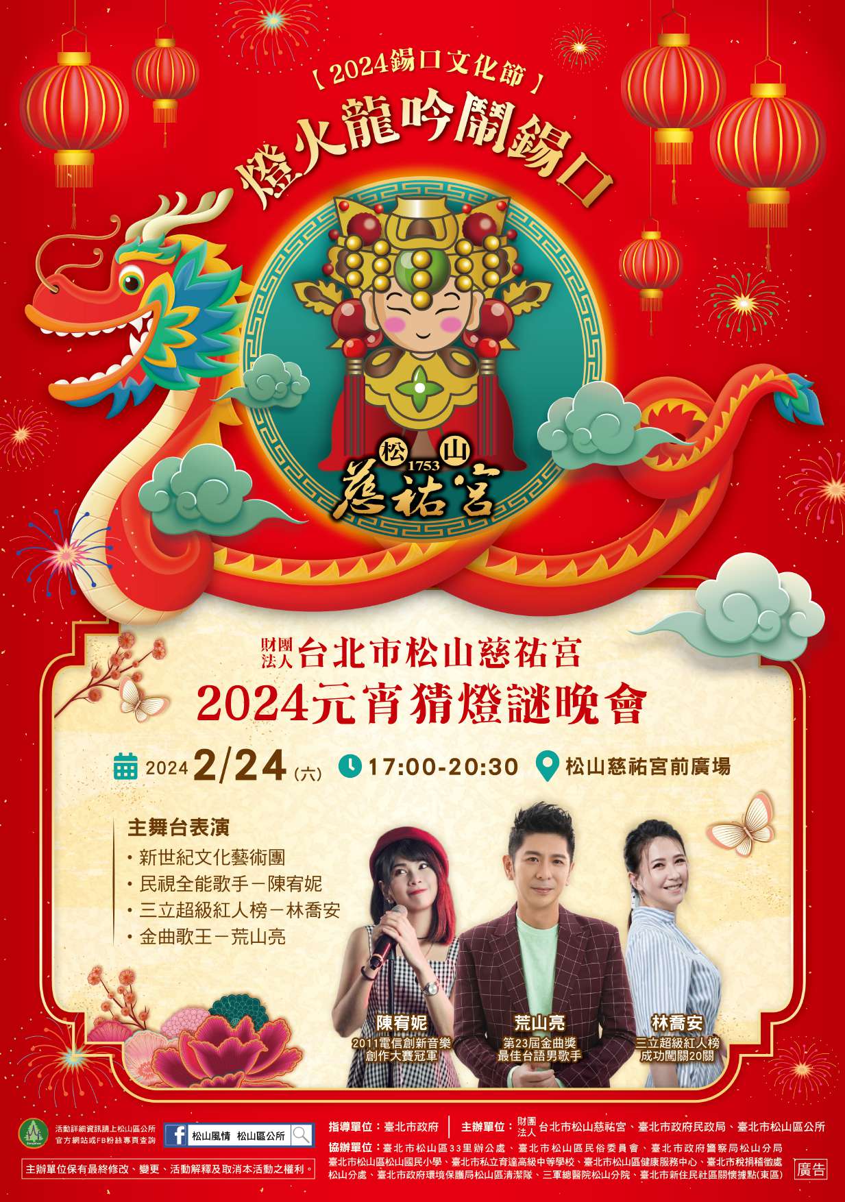 (一)松山區公所「2024錫口文化節」113年2月24日邀 請您一同至松山慈祐宮廟前廣場參與「2024錫口文化節 元宵猜燈謎晚會.燈火龍吟鬧錫口」活動。