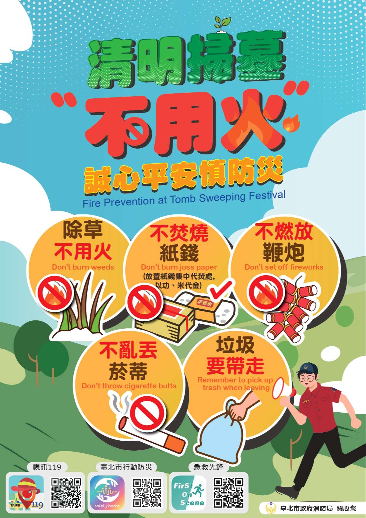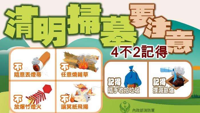 (一)清明掃墓慎終追遠時節,為避免林野火災發生,請市民朋友掃墓祭祖不使用火源,多加利用本市集中代焚紙錢及線上祭祖服務,並且除草不用火、帶走垃圾、勿亂丟菸蒂、燃放爆竹,共同做好防火工作。