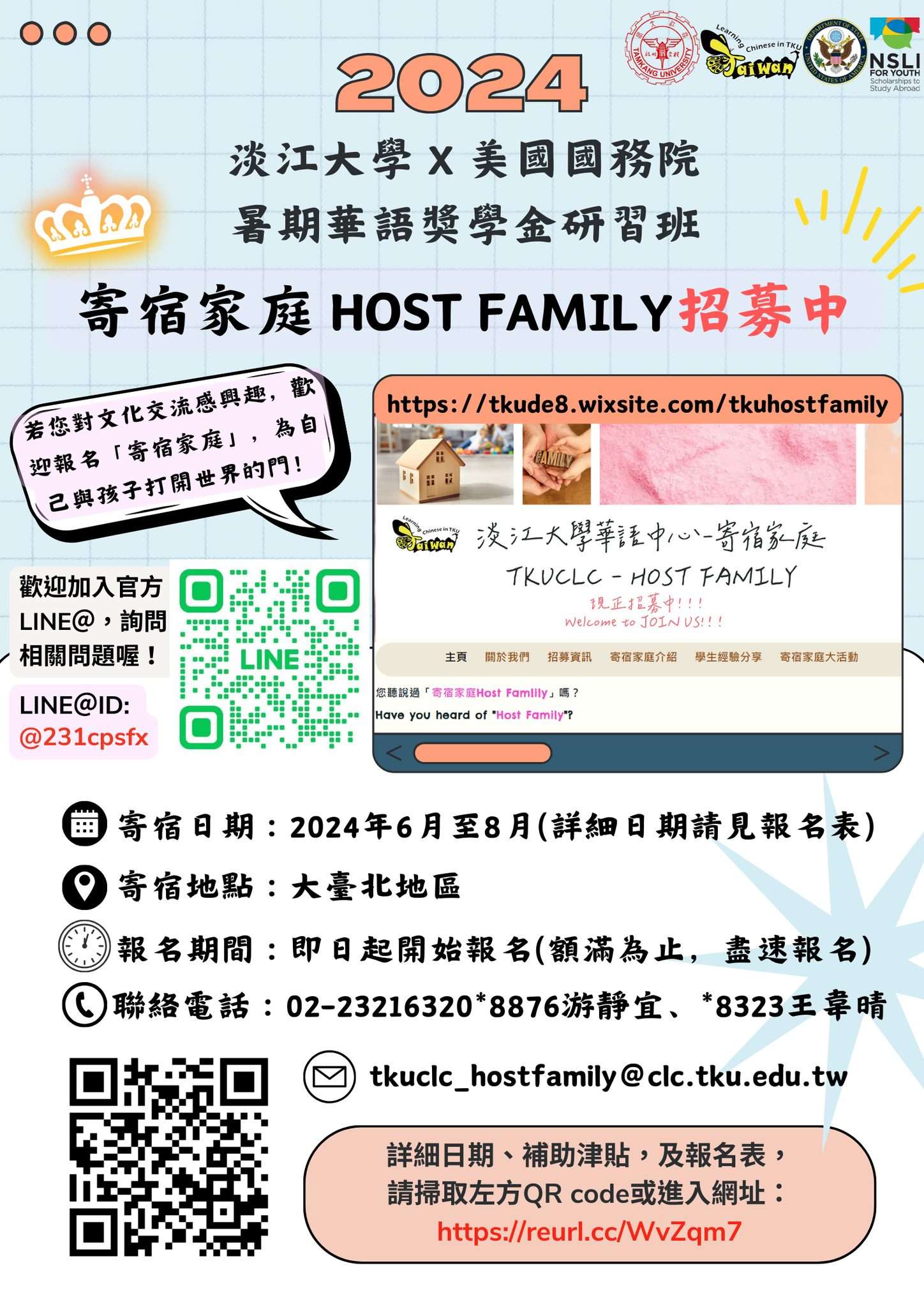 寄宿家庭徵選條件如下: (一)寄宿期間:自113年6月中旬至113年8月中旬期間(可彈 性選擇)。 (二)接待對象:NSLI-Y高中生、CLS大學生、OPIT大學生、淡 大領航計畫大學生、TISLP大學生、密西西比大學大學 生。 (三)寄宿地點:大臺北地區(近淡水、士林、關渡、北投尤 佳)。 (四)接待條件:需提供學生獨立房間或單人床(上下鋪亦 可)、學生寄宿期間的膳食及安排學生與家庭共同出 遊、僅接待旨揭中心研習班學生。