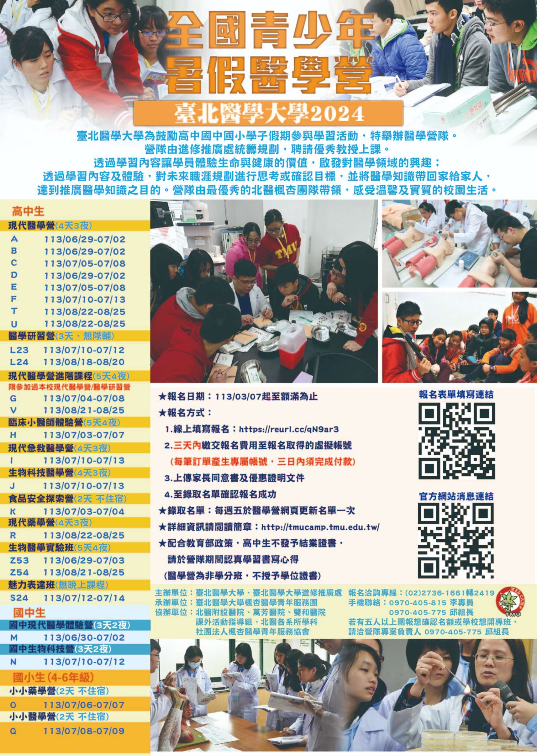 營隊資訊:2024暑期醫學營擬訂於民國113年6月29日至8月 25日辦理。網址 http://tmucamp.tmu.edu.tw/