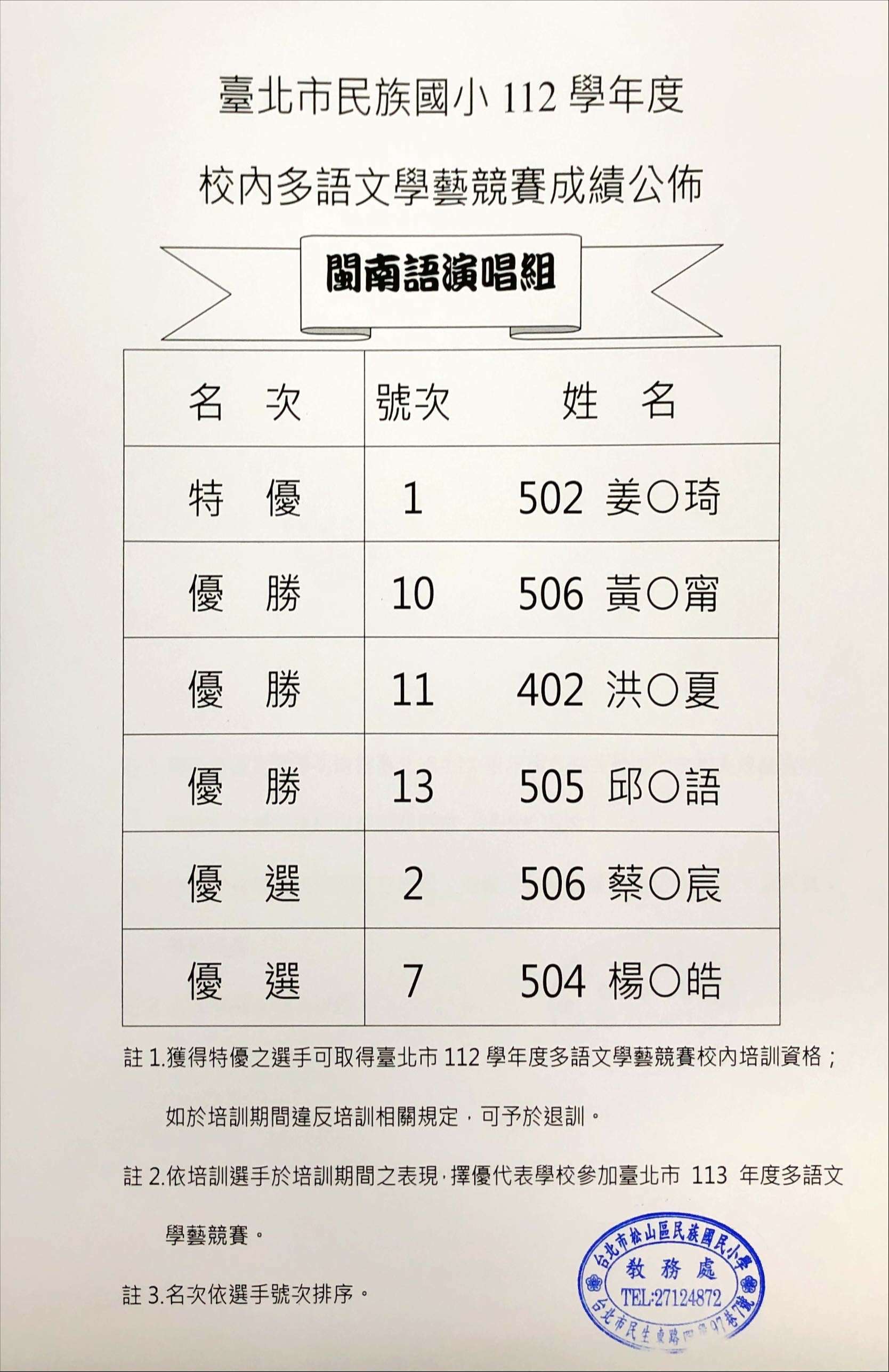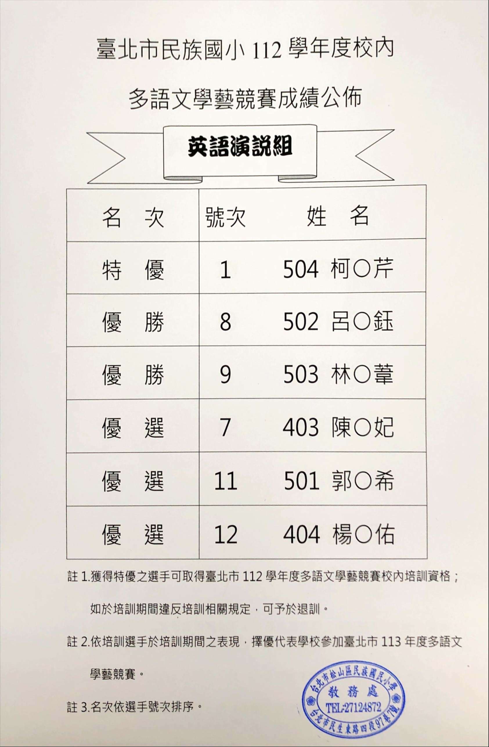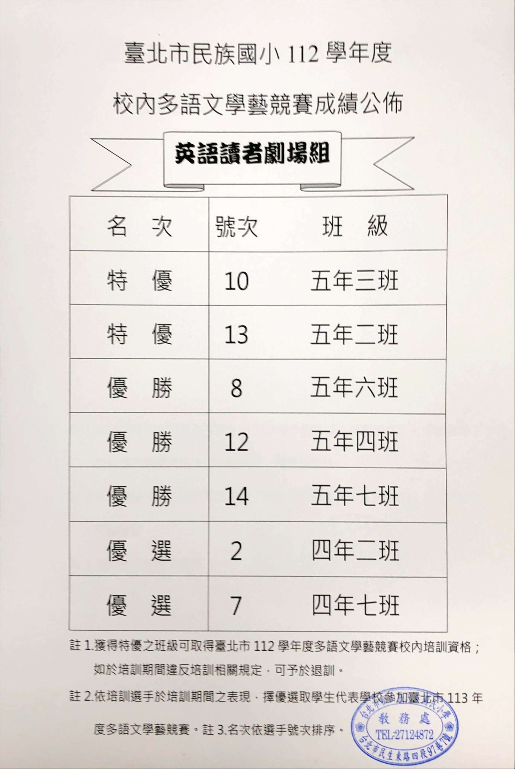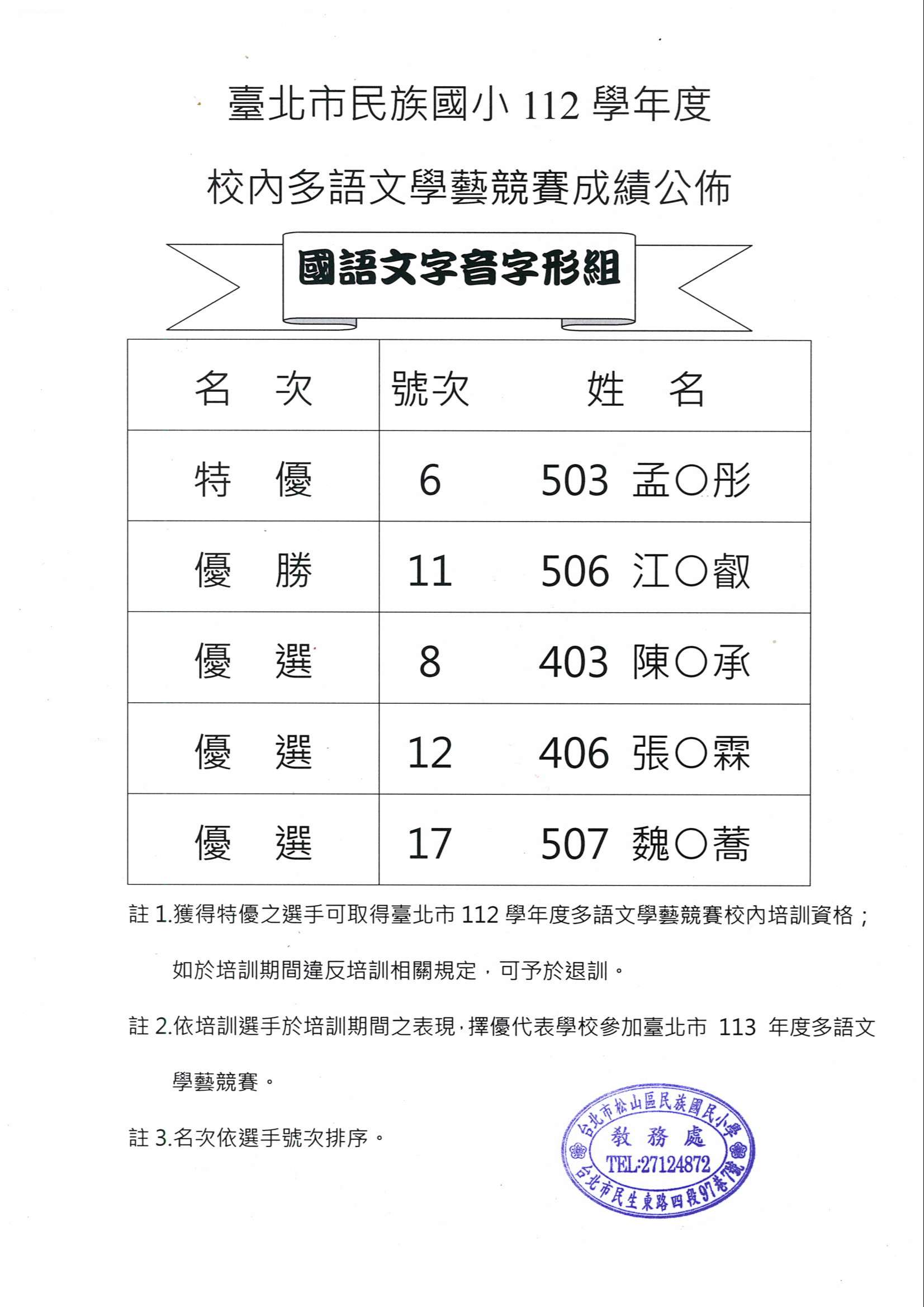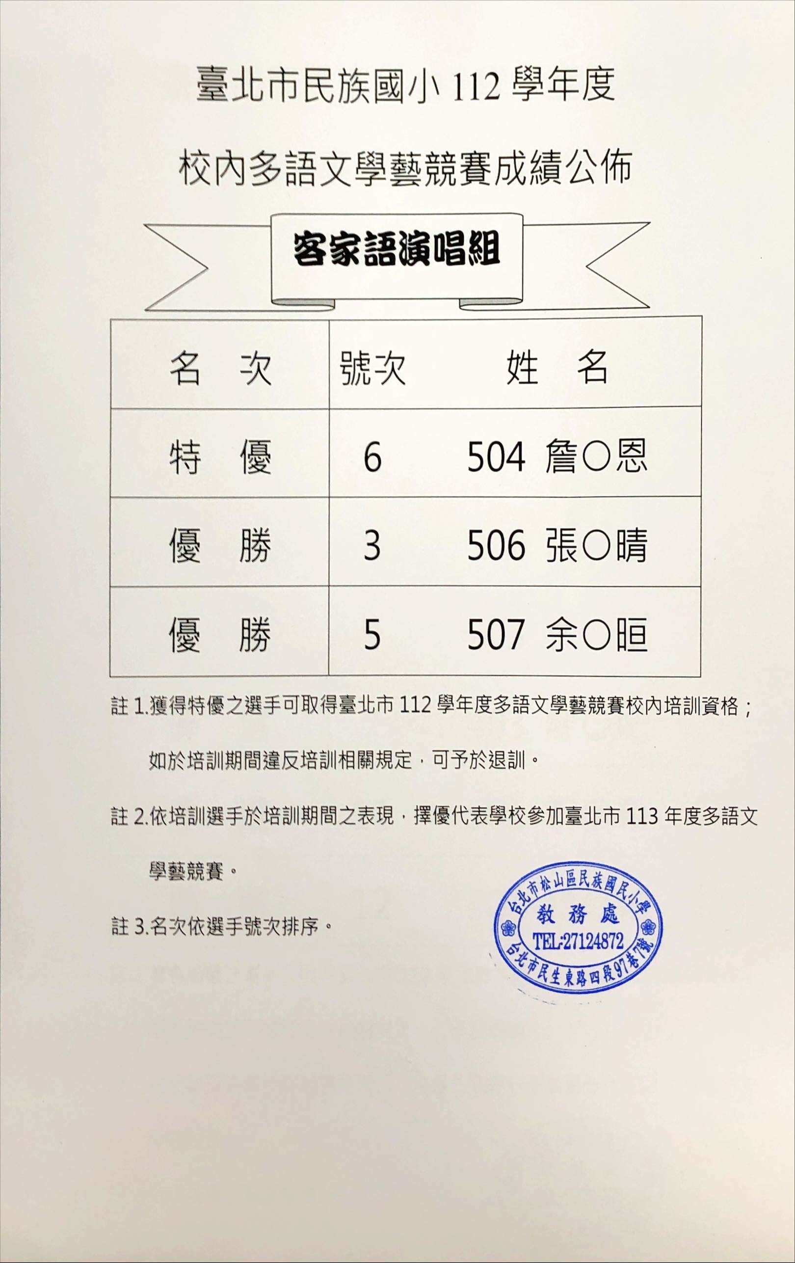 國語字音字形、國語作文、國語(書法)寫字、國語朗讀、客家語演唱、閩南語演唱、國語演說、客家語朗讀、閩南語朗讀、英語演說、英語讀者劇場以及英語戲劇 共12項賽事