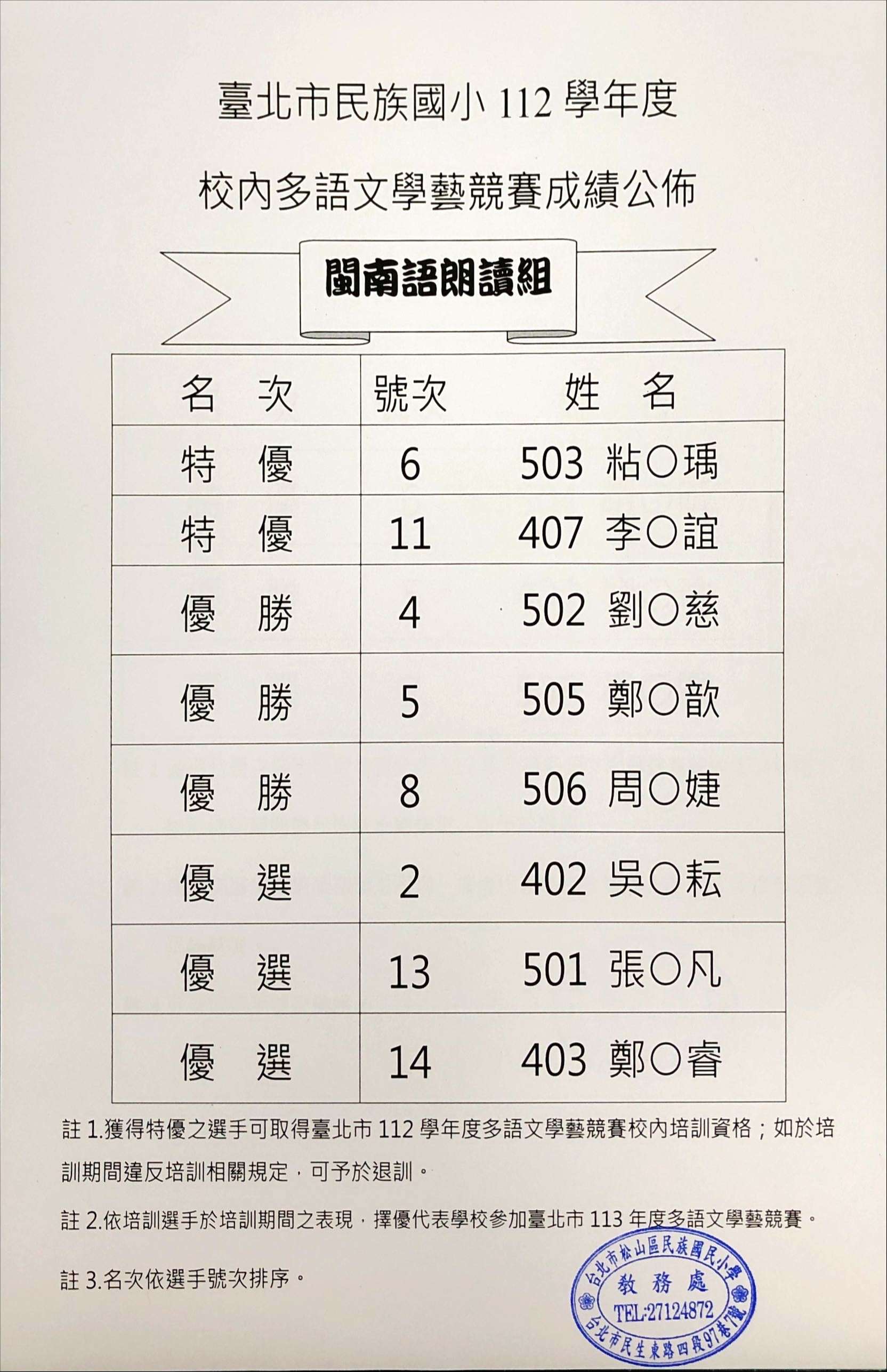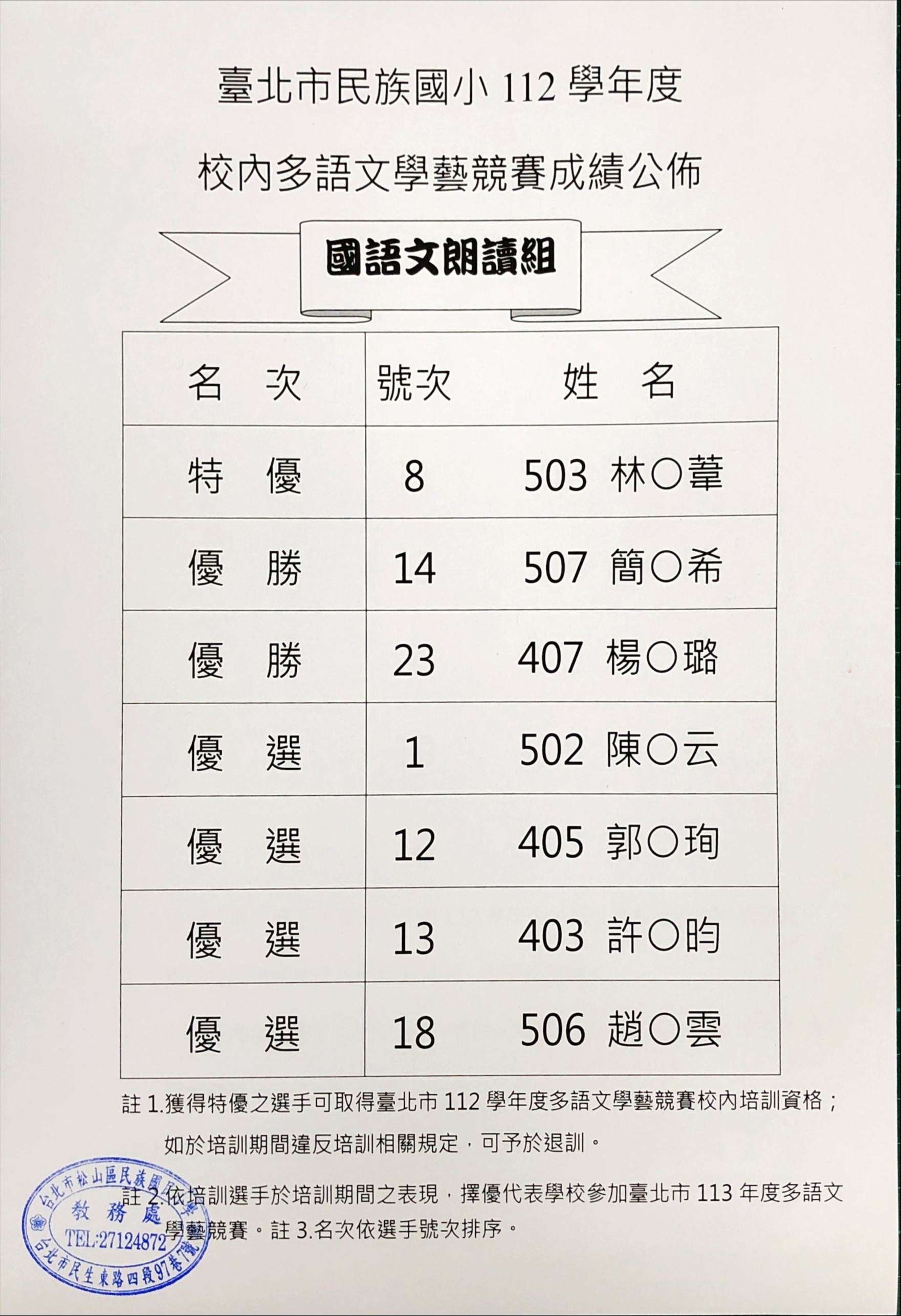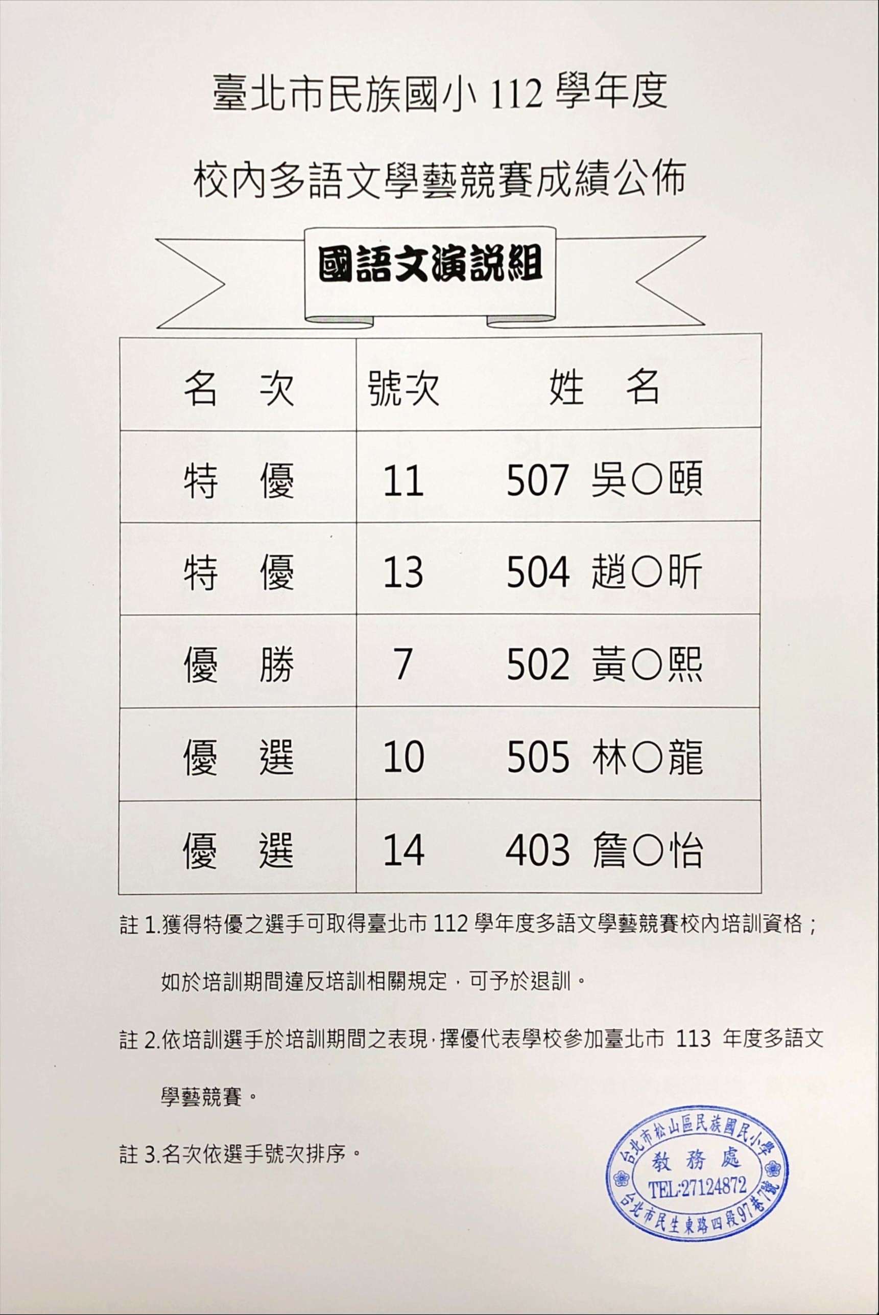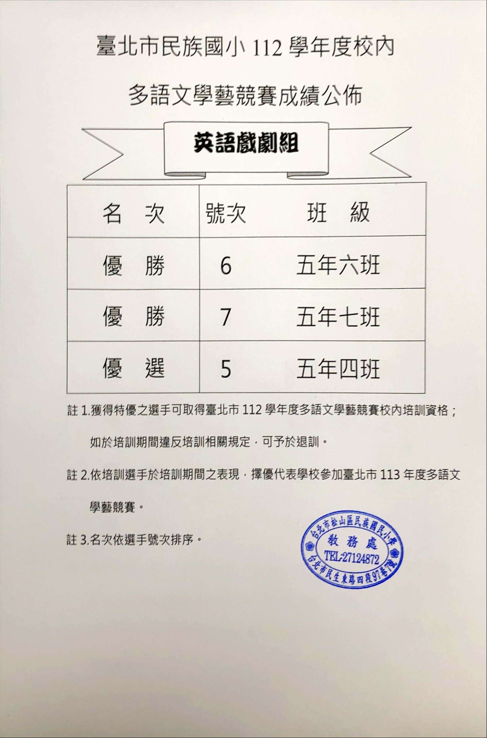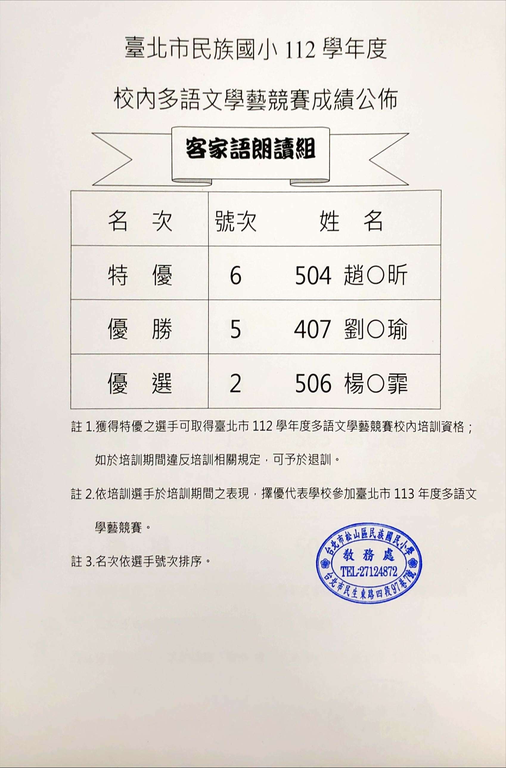 國語字音字形、國語作文、國語(書法)寫字、國語朗讀、客家語演唱、閩南語演唱、國語演說、客家語朗讀、閩南語朗讀、英語演說、英語讀者劇場以及英語戲劇 共12項賽事