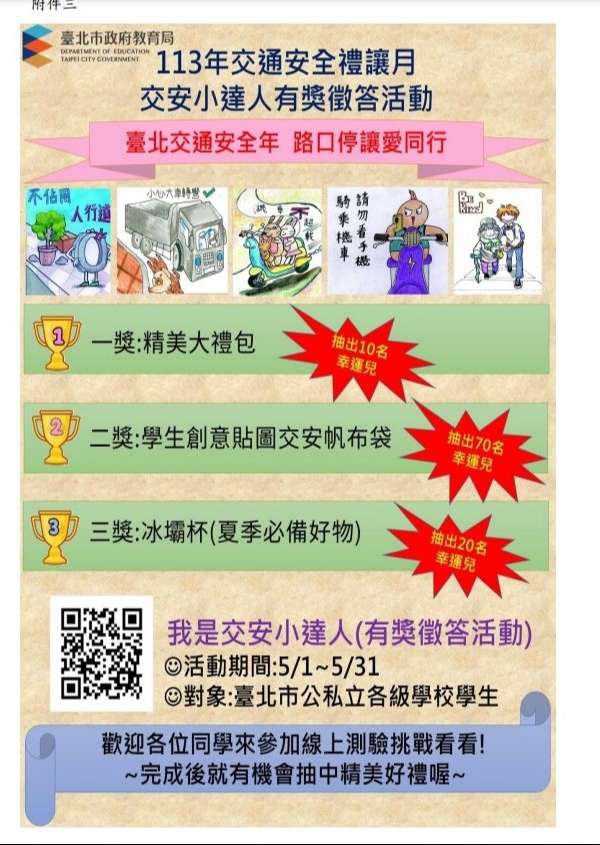 2.活動方式:鼓勵學生可以參加線上測驗,測驗自己對於交通安全的觀念是否足夠。本局將採電腦隨機抽獎(測驗滿分者)發送交通安全精美宣導品。