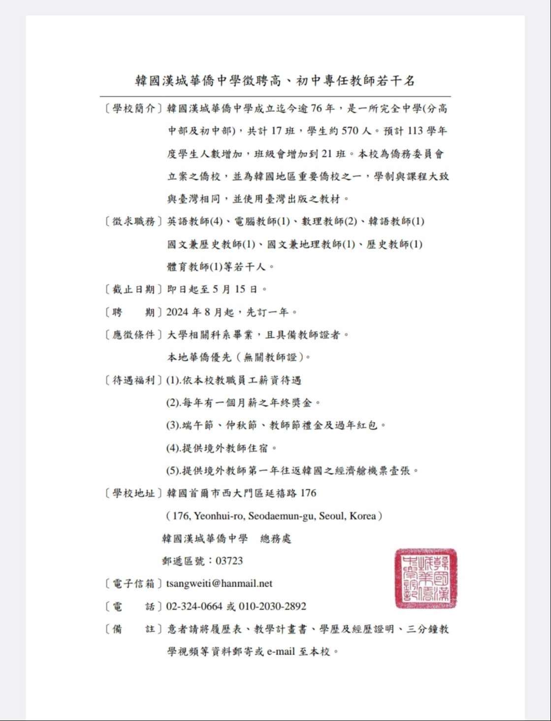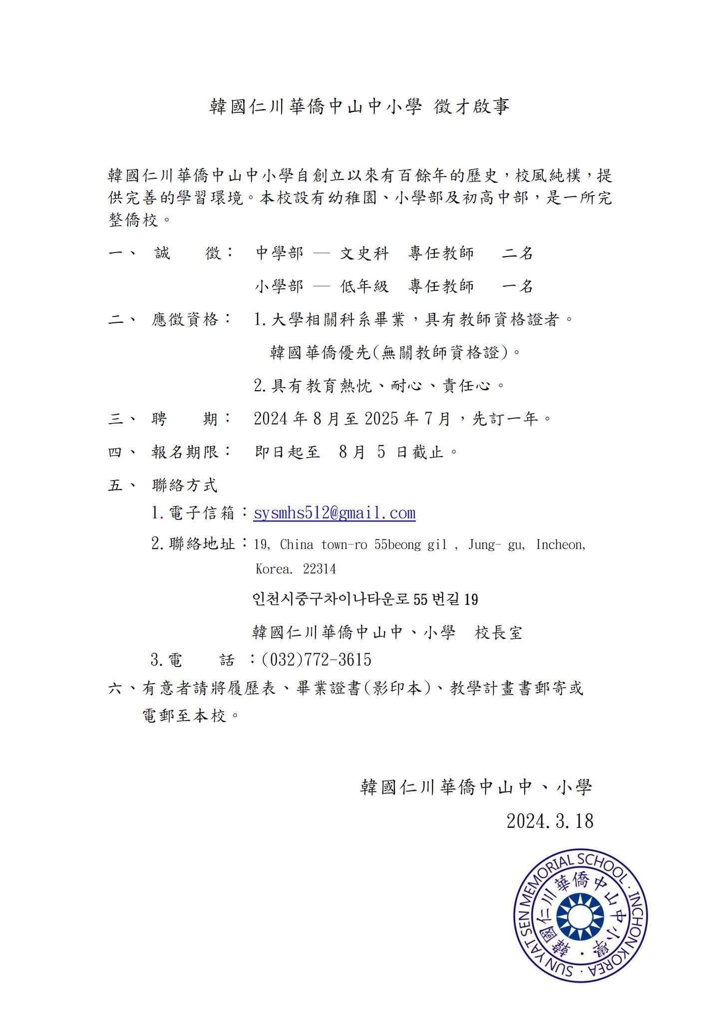 主旨:轉知韓國地區仁川華僑中山中小學及漢城華僑中學113年 徵聘教師啟事各1則,詳如說明,請查照。