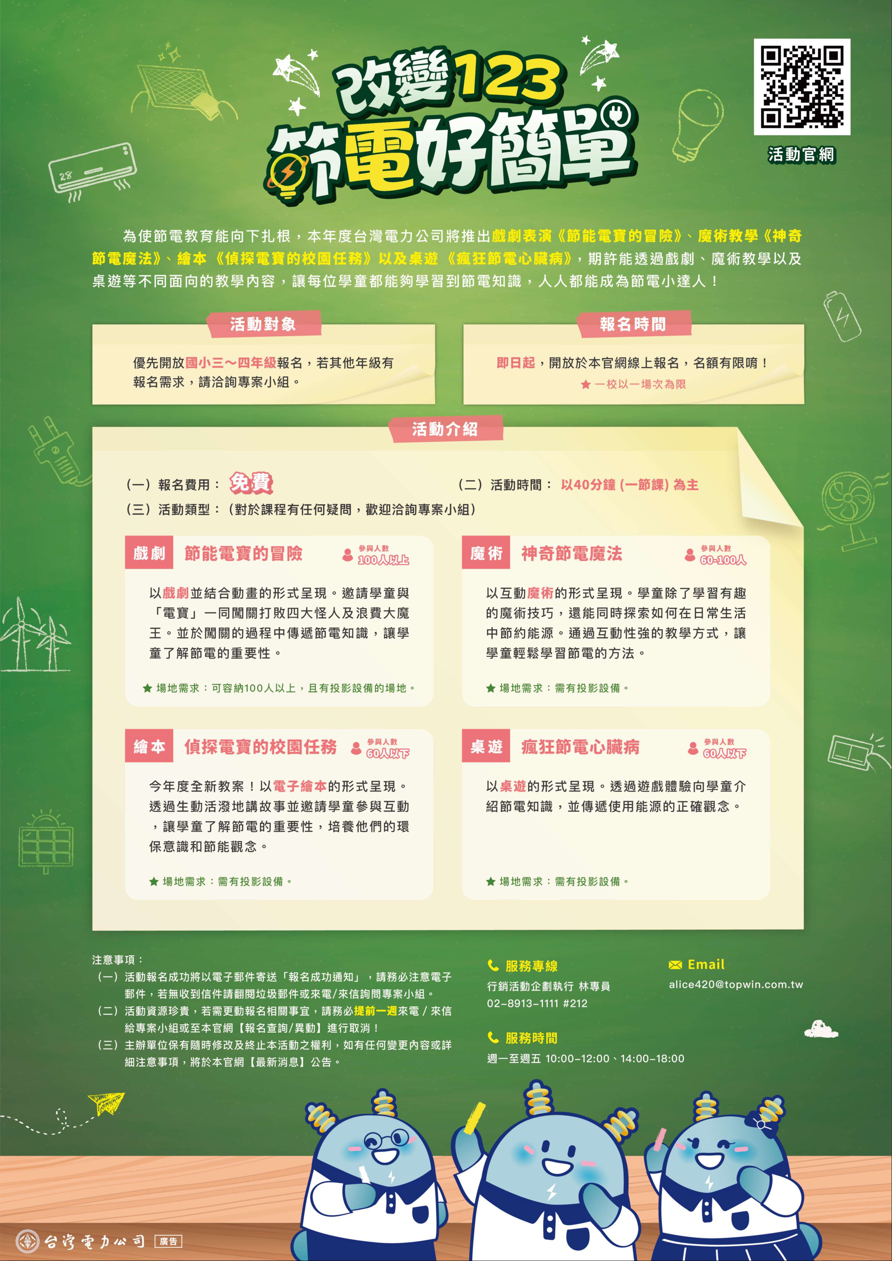 本次主題為「改變123,節電好簡單」,宣導對象為國小3、4年級學生,以淺顯易懂之教案遊戲引導學童了解節電知識。