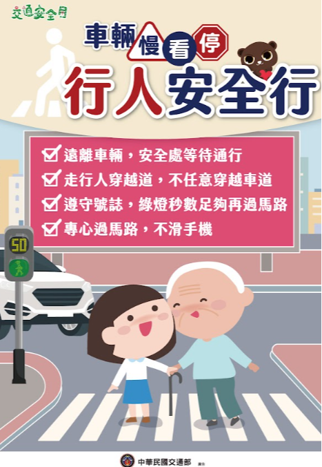 113年9月交通安全月宣導主題為「車輛慢看停,行人安全行」