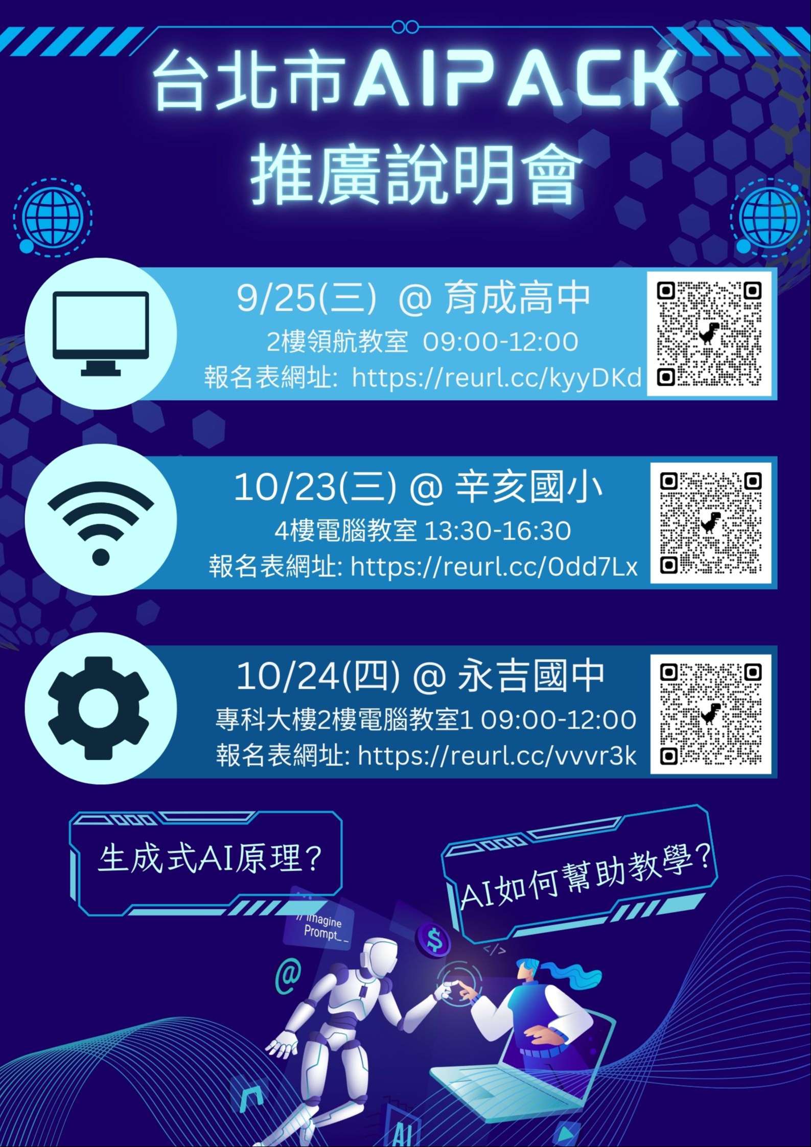 二、為協助職前及在職教師掌握AI工具使用,提升教學品質和 學生學習成效,由本校「臺北市數位學習推動辦公室」(以 下簡稱推辦)和國立臺中教育大學「測驗統計與適性學習研 究中心」,協力規劃旨揭方案研習課程共計3場次,摘述如 下: