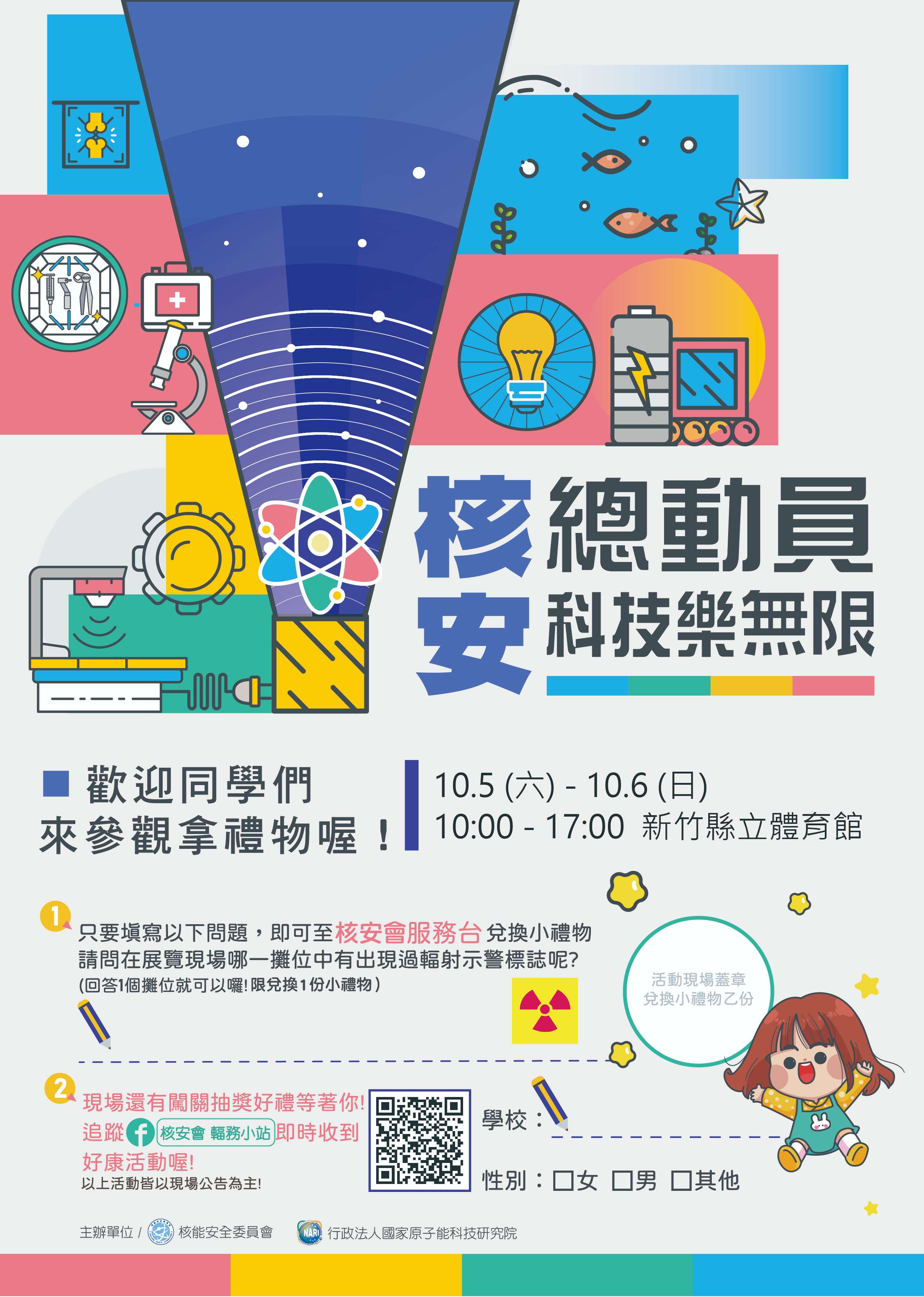 科普展將透過闖關遊戲,以趣味性方式介紹「輻射在生活中的應用與防護、如何檢測海洋中的氚、核電廠怎麼除役、什麼是核廢料」等內容,現場亦有摸彩活動,鼓勵學生踴躍參加。
