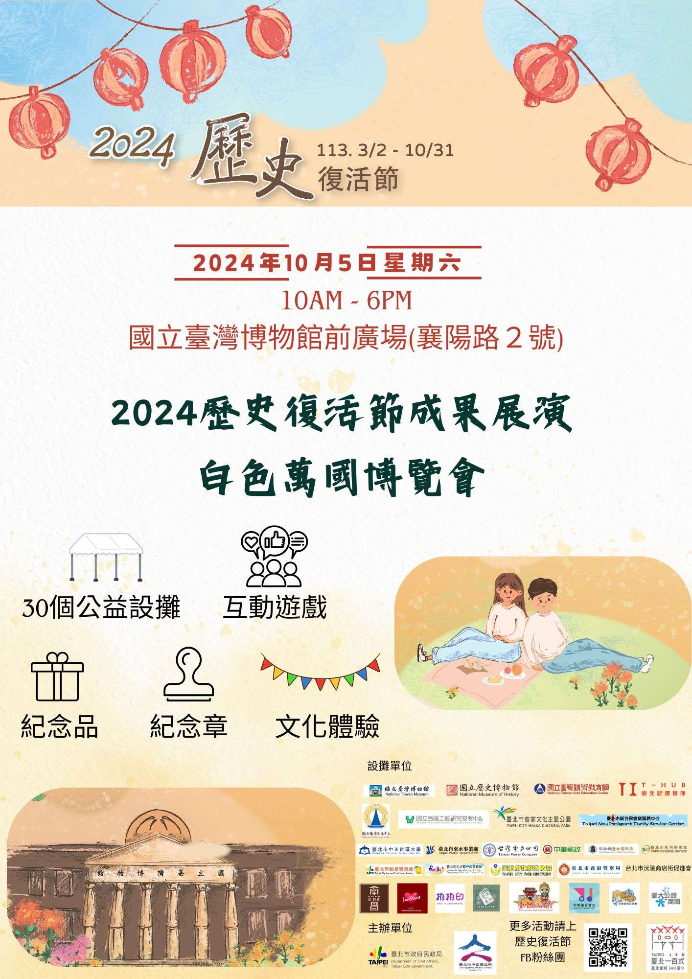 113年度基層藝文活動「2024歷史復活節:白色萬國博覽會」將於113年10月5日(星期六)上午10時至下午6時假二二八和平公園-國立臺灣博物館本館(襄陽路2號)前廣場舉辦。