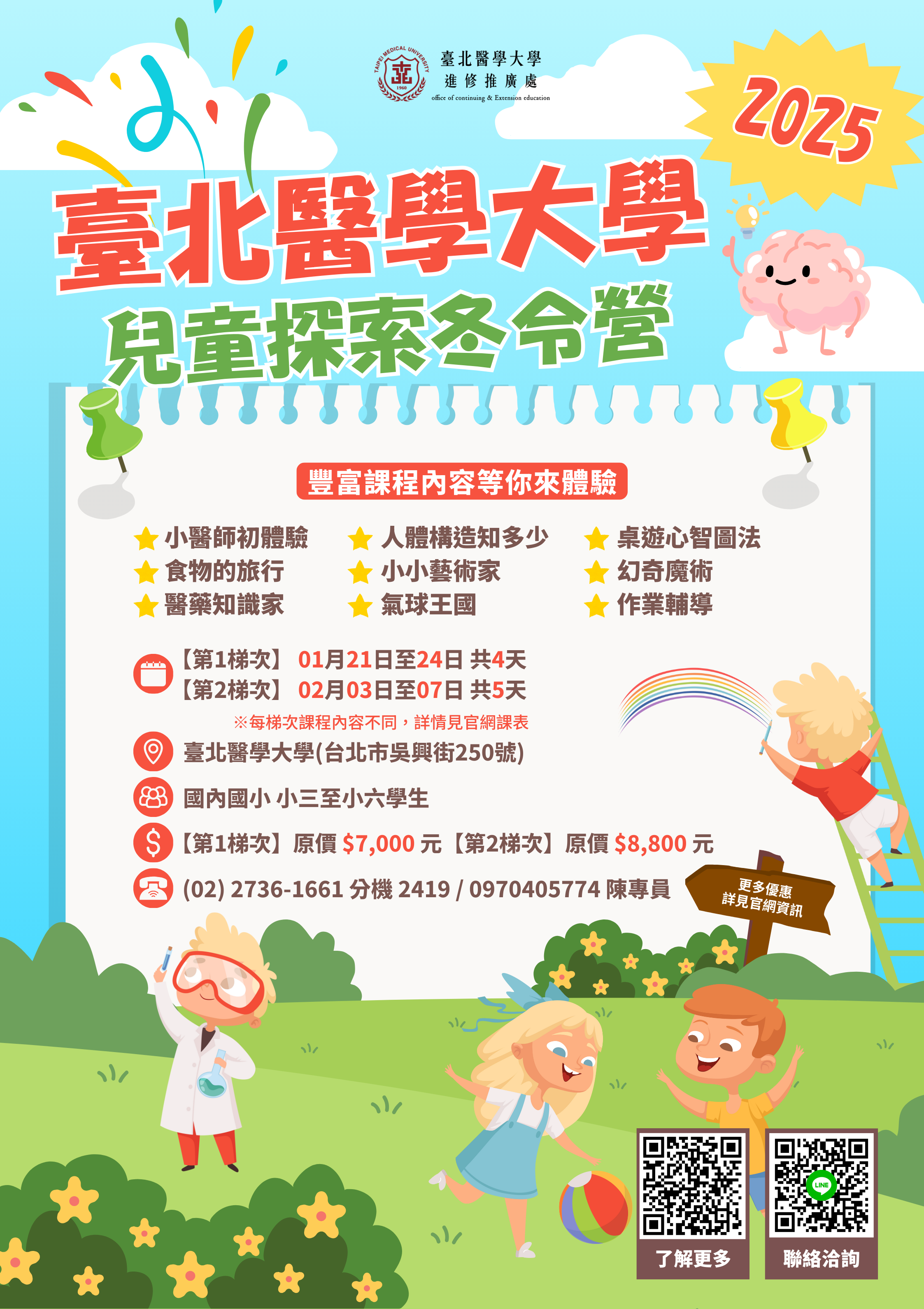 一、臺北醫學大學為鼓勵國小學生參與學習活動,辦理相關醫學課程及學習活動,希望能增進對醫藥及日常健康的知識。 二、營隊資訊:擬訂於民國114年1月21日至114年2月7日辦理。 三、相關營隊簡章及海報,詳見附件。