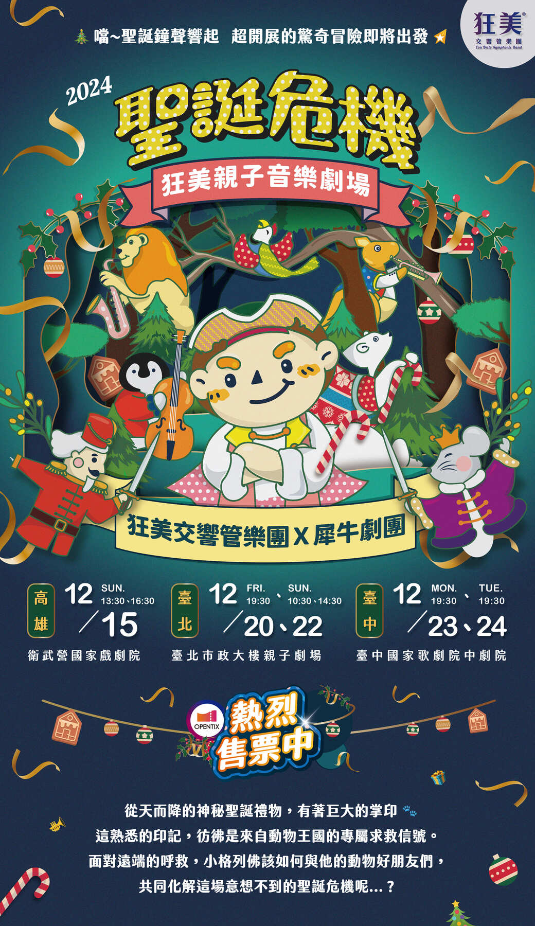 一、節目介紹:狂美交響管樂團x犀牛劇團-跨界親子音樂劇場《聖誕危機》從天而降的神秘聖誕禮物,有著巨大的掌印這熟悉的印記,彷彿是來自動物王國的專屬求救信號。面對遠端的呼救,小格列佛該如何與他的動物好朋友們,共同化解這場意想不到的聖誕危機呢...?