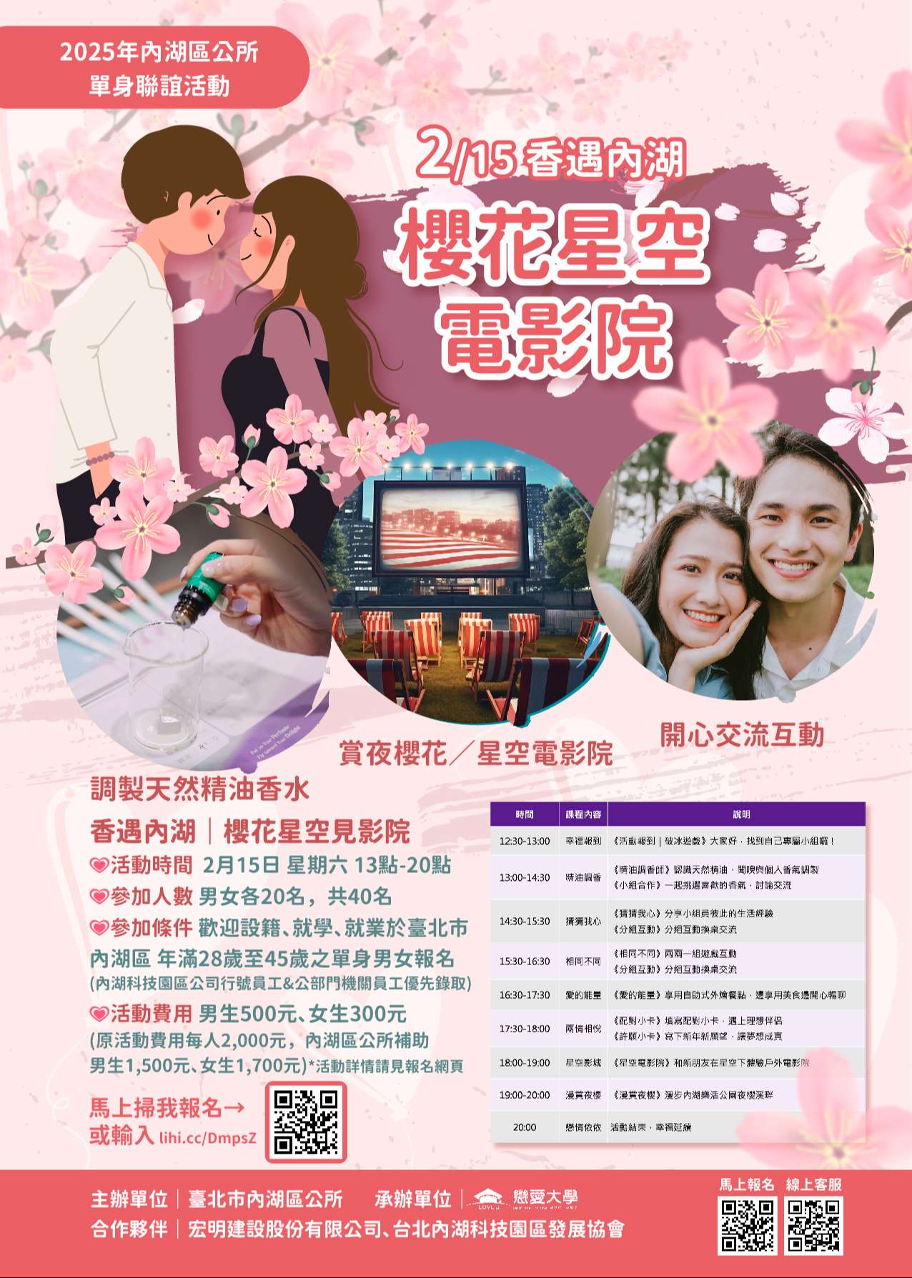 主旨:為辦理本所114年度「香遇內湖,櫻花星空電影院」單身聯誼活動,請貴單位協助宣傳並鼓勵所屬踴躍參加,請查照。