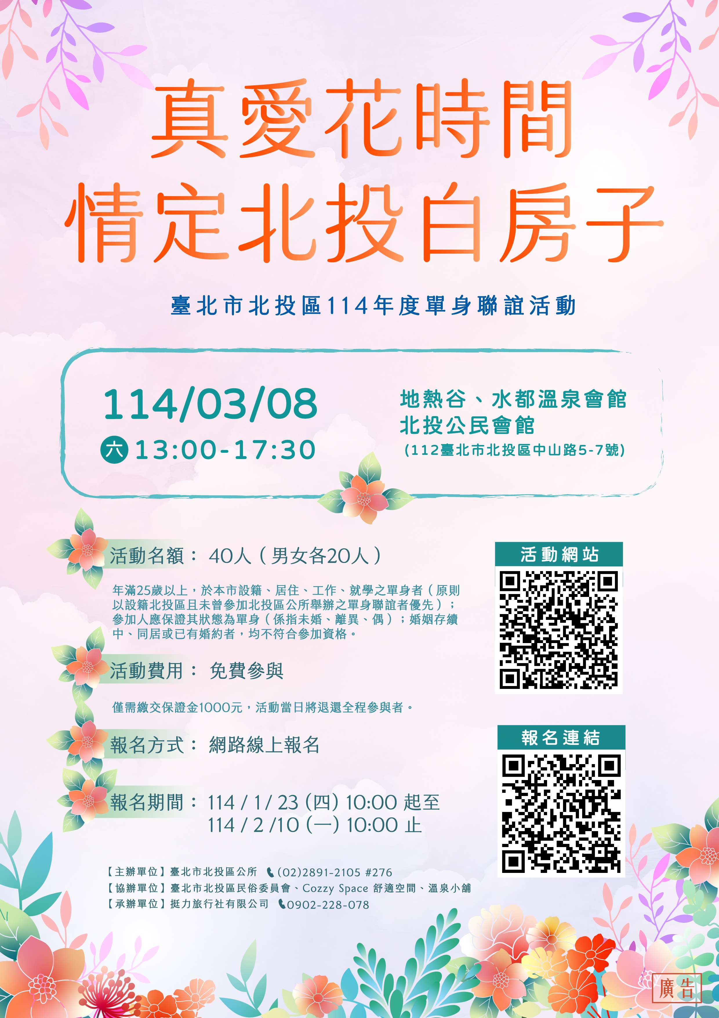 主旨:本所114年度第1場單身聯誼活動「真愛花時間:情定北投