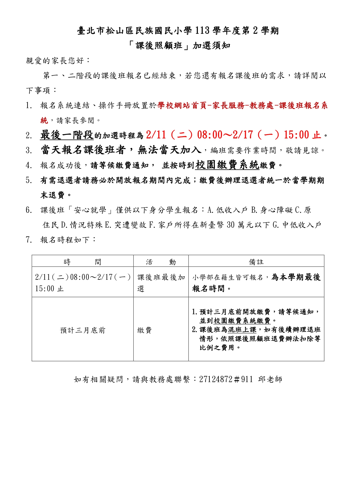 第一、二階段的課後班報名已經結束,若您還有報名課後班的需求,請詳閱以下事項: