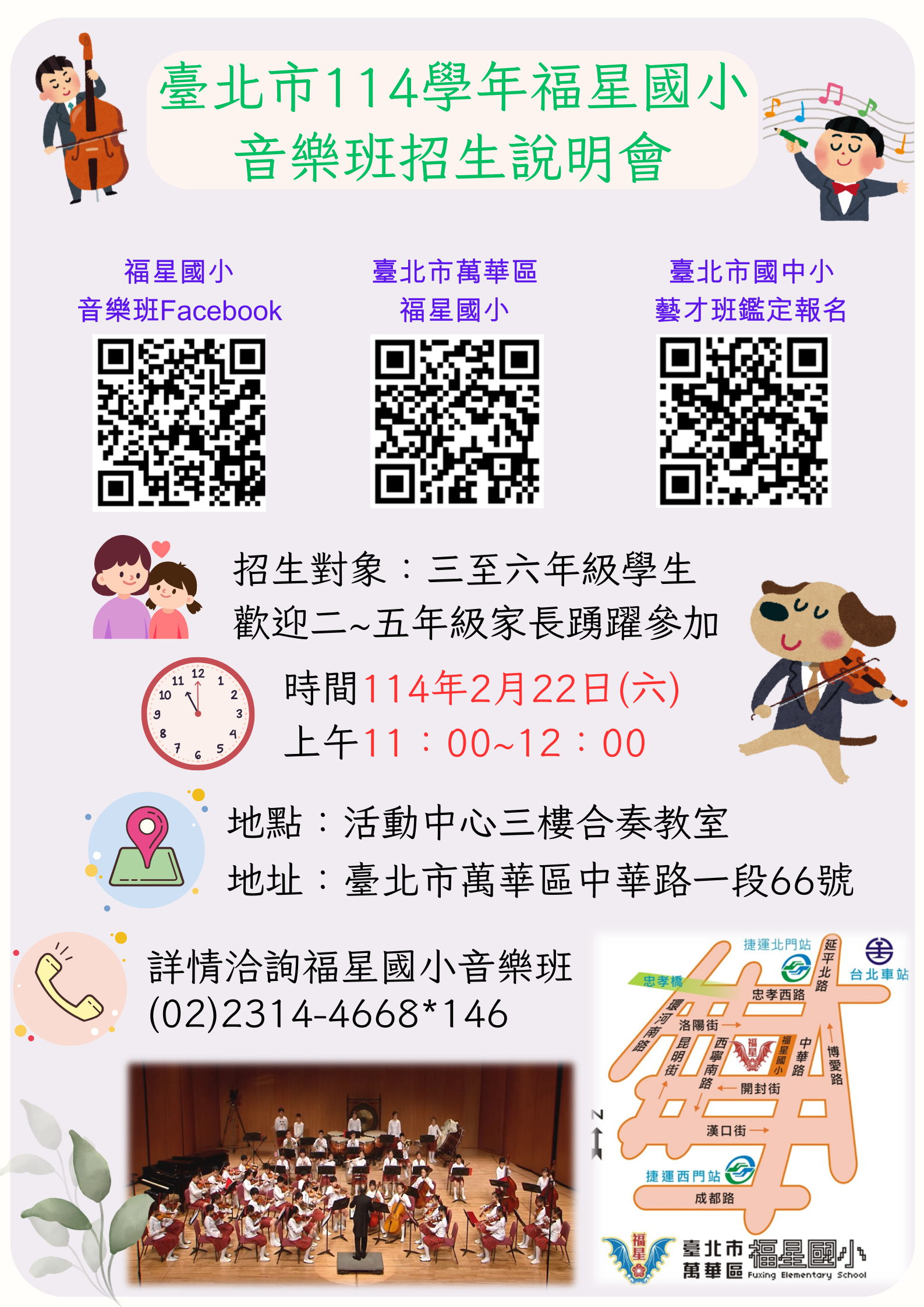 若有任何問題,請致電福星國小音樂班公室02-23144668分機 146資料組。