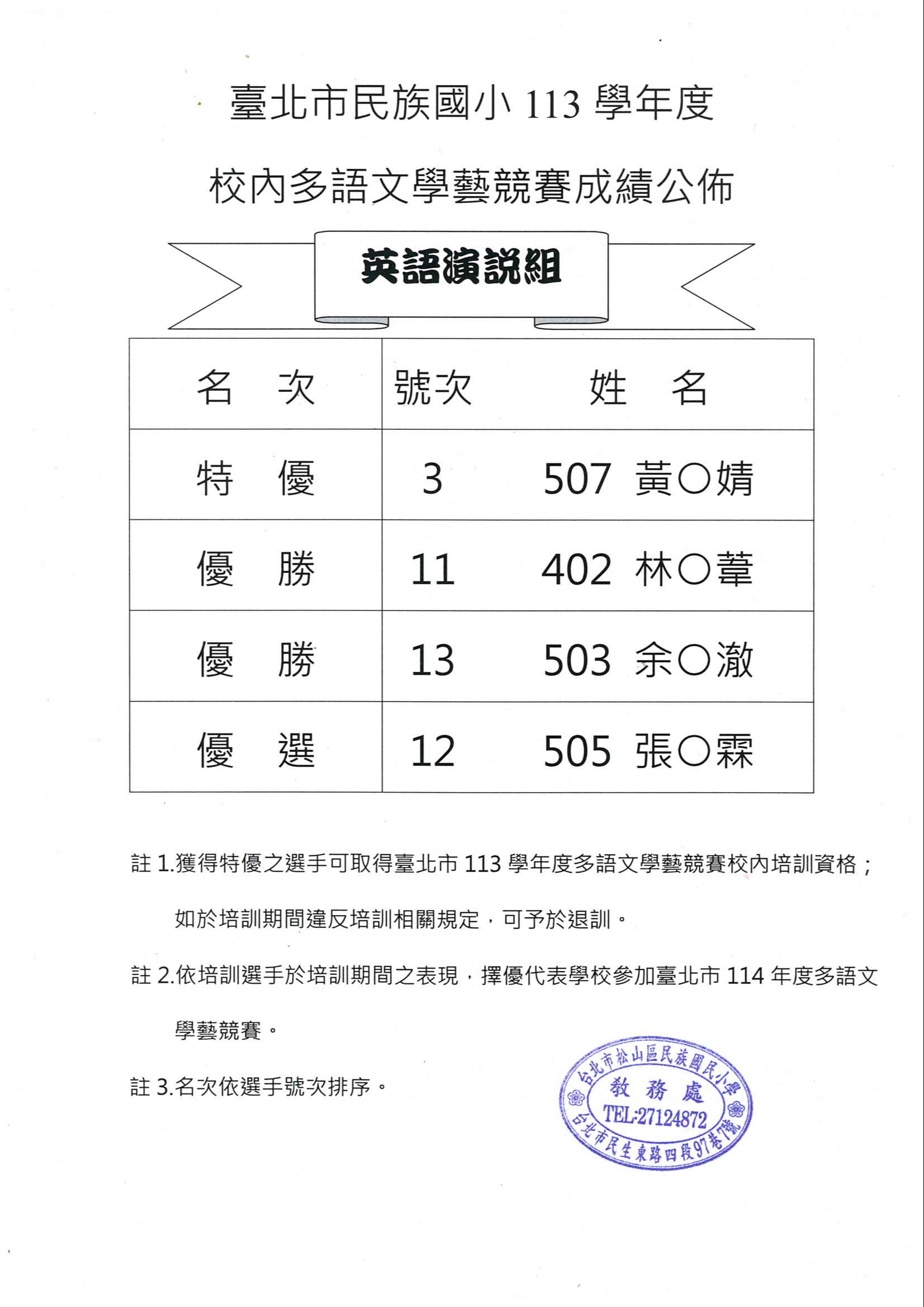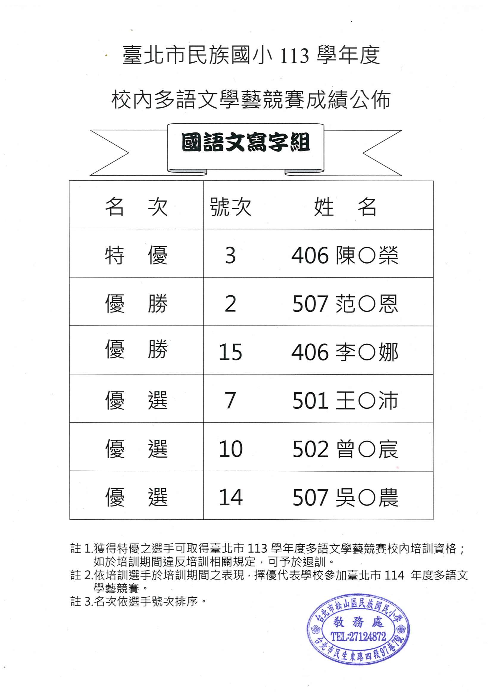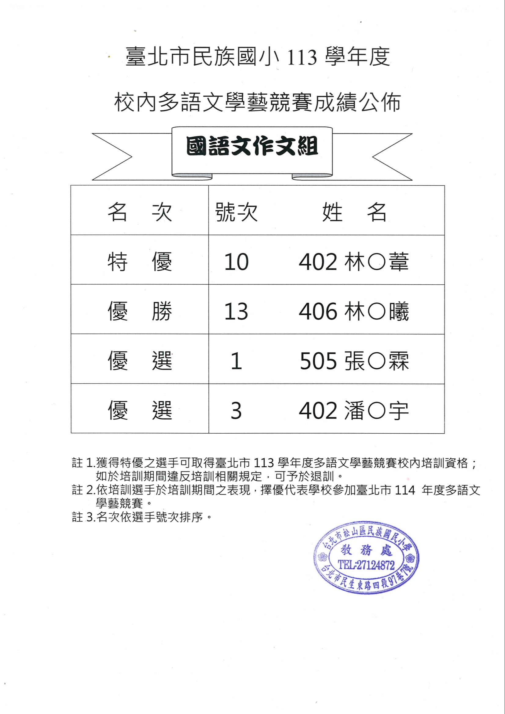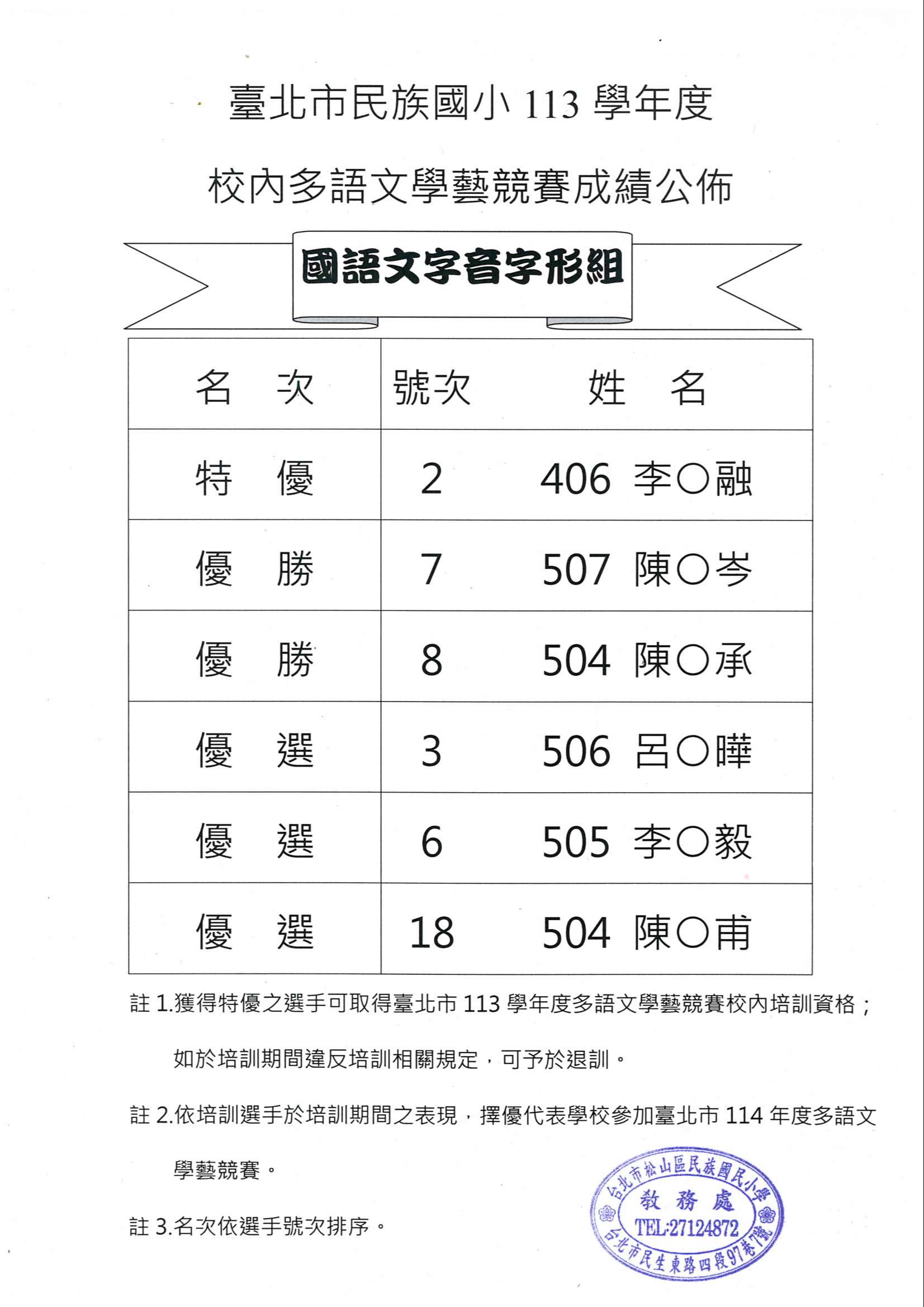 113 學年度 校內多語文競賽 第一階段 賽事成績公告 (姓名遮罩版)