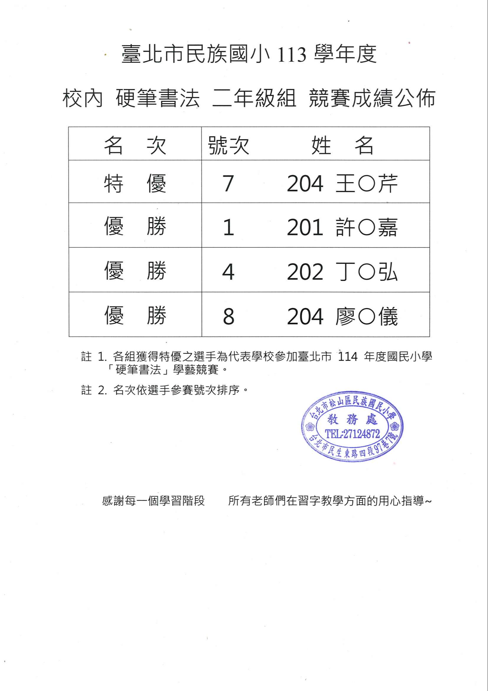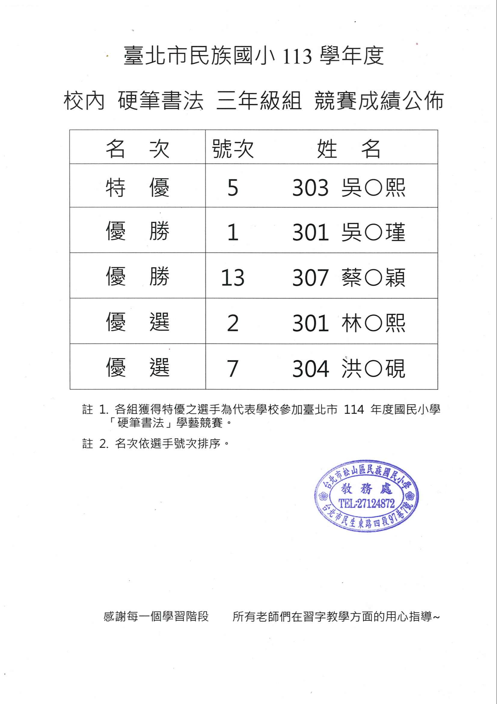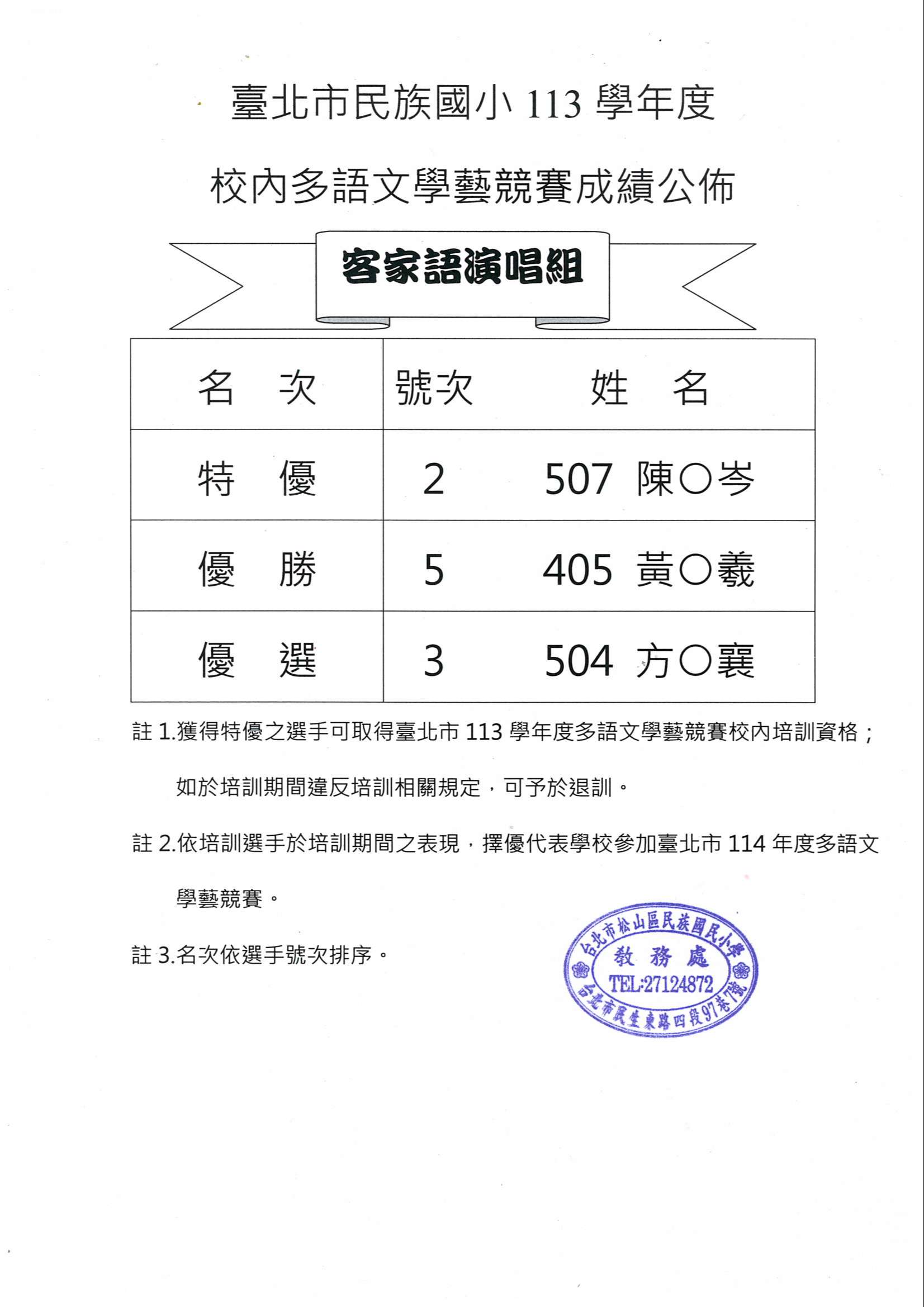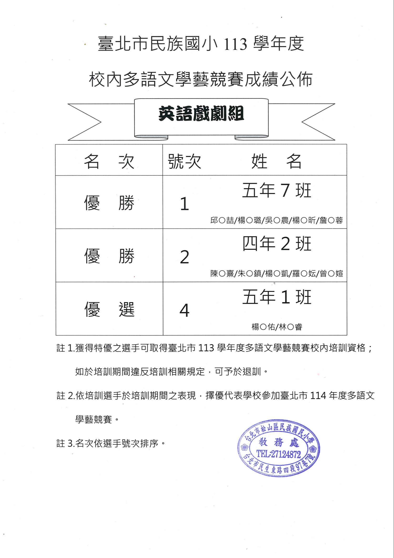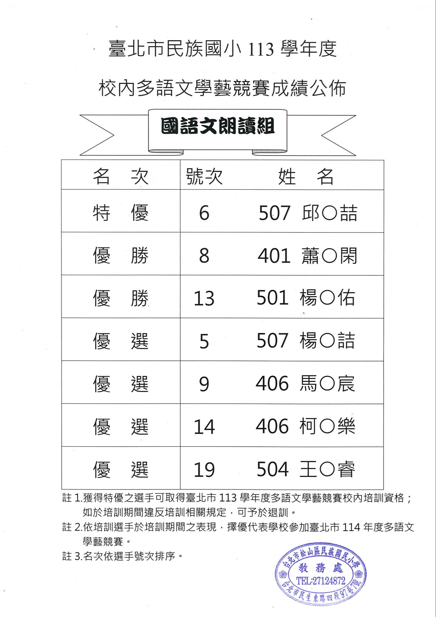 113 學年度 校內多語文競賽 第一階段 賽事成績公告 (姓名遮罩版)