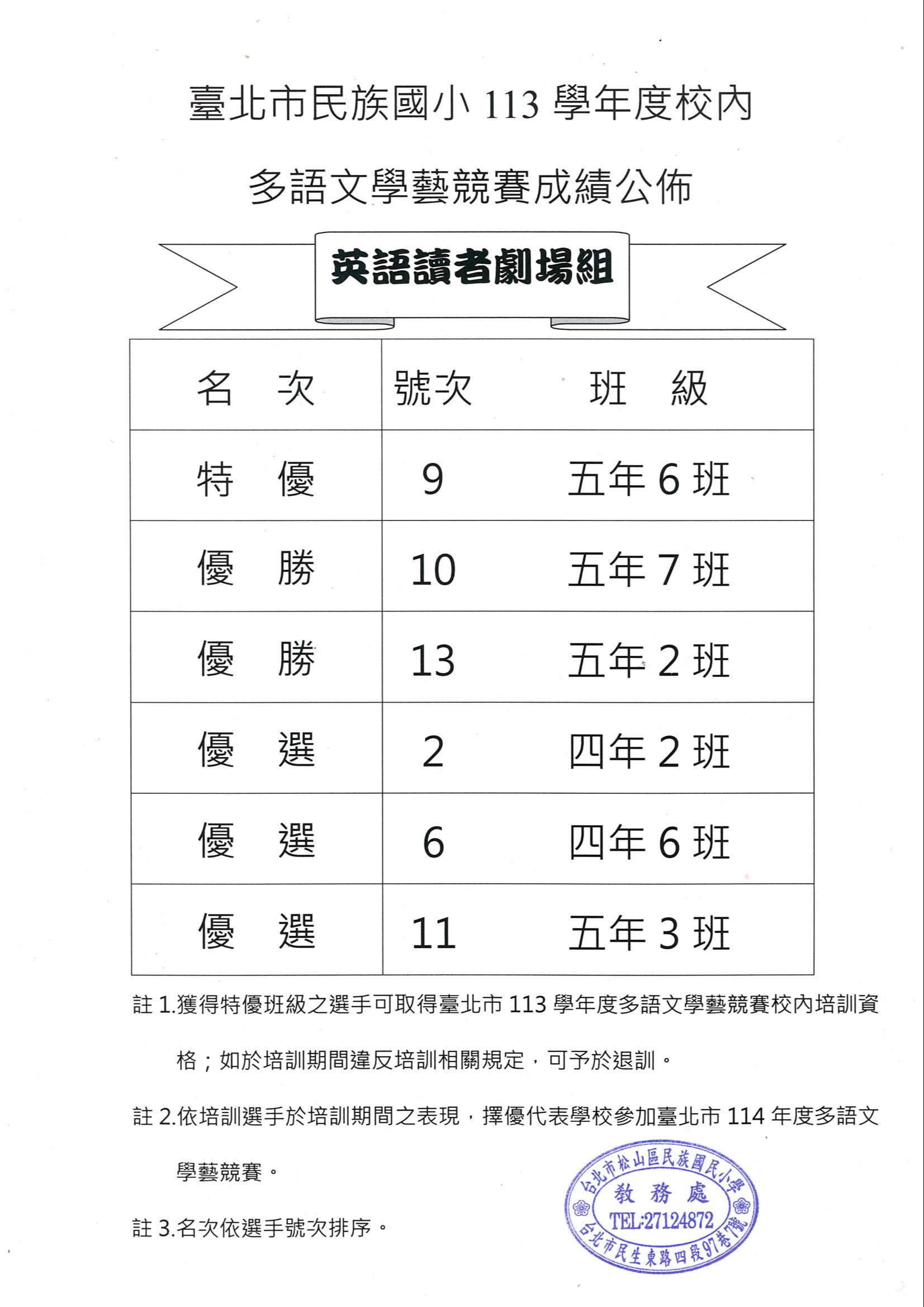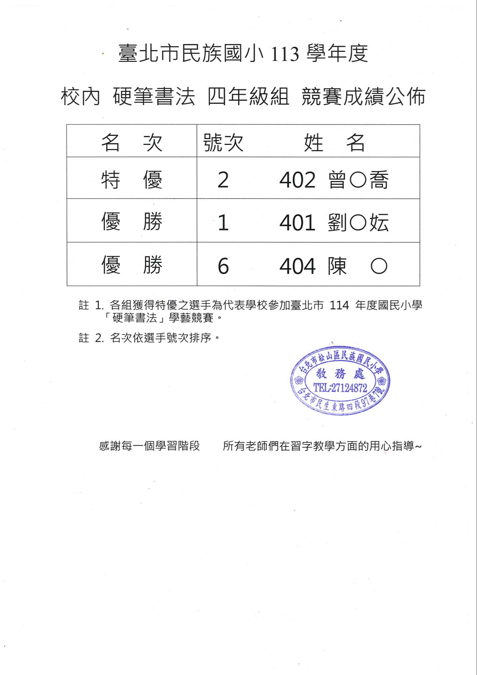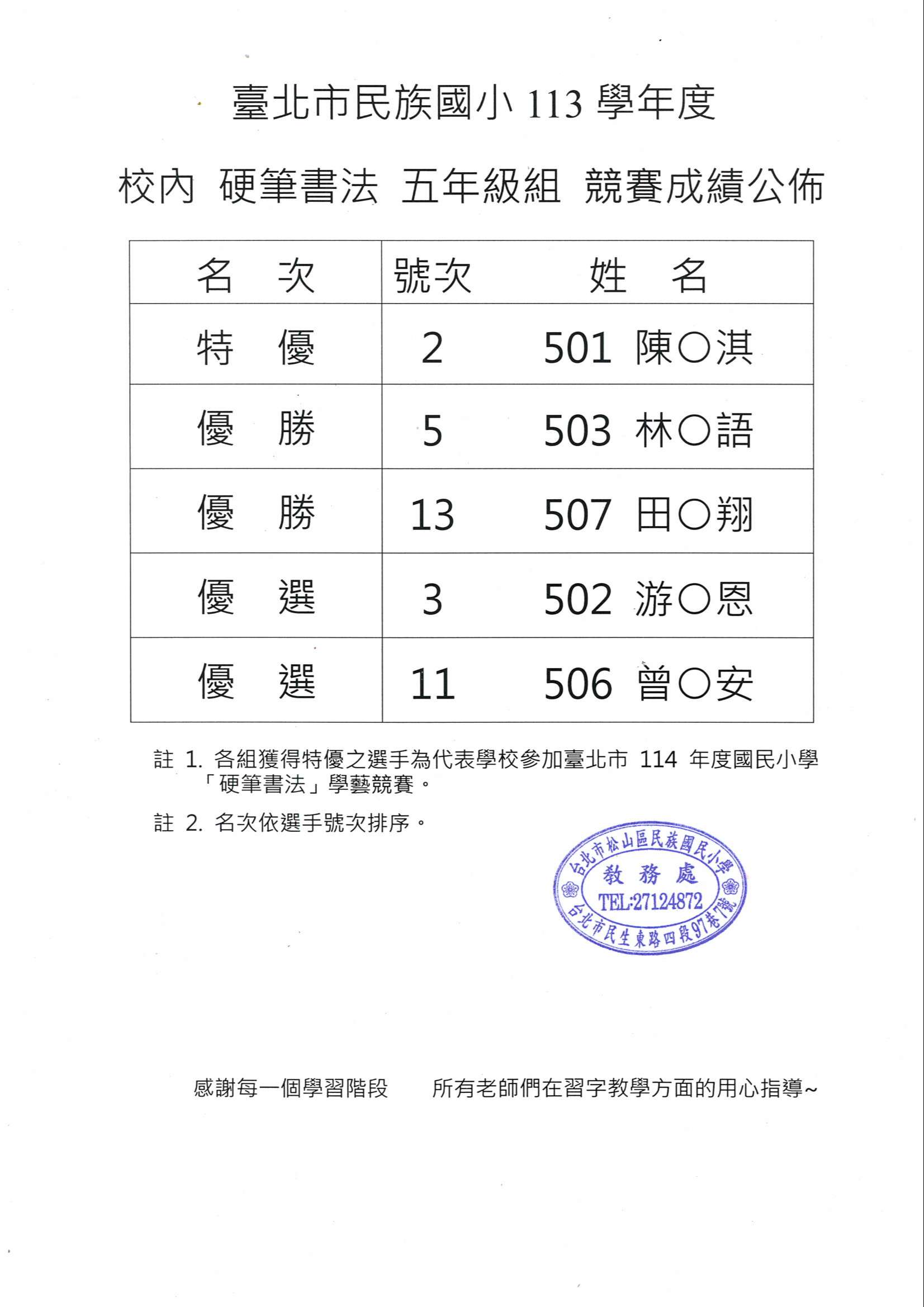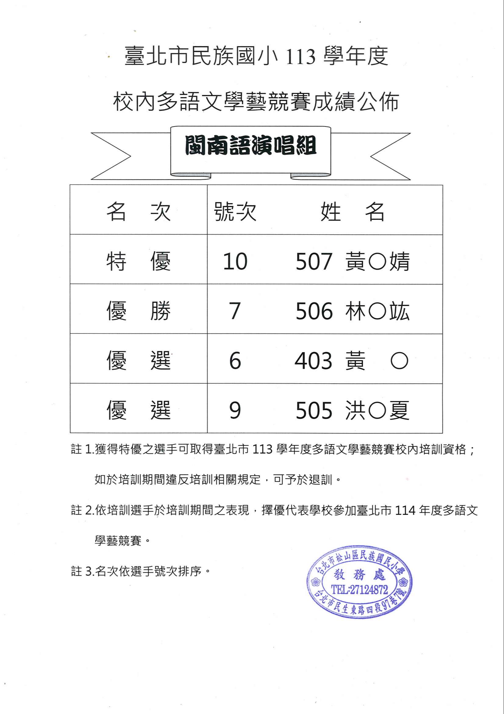 113 學年度 校內多語文競賽 第一階段 賽事成績公告 (姓名遮罩版)