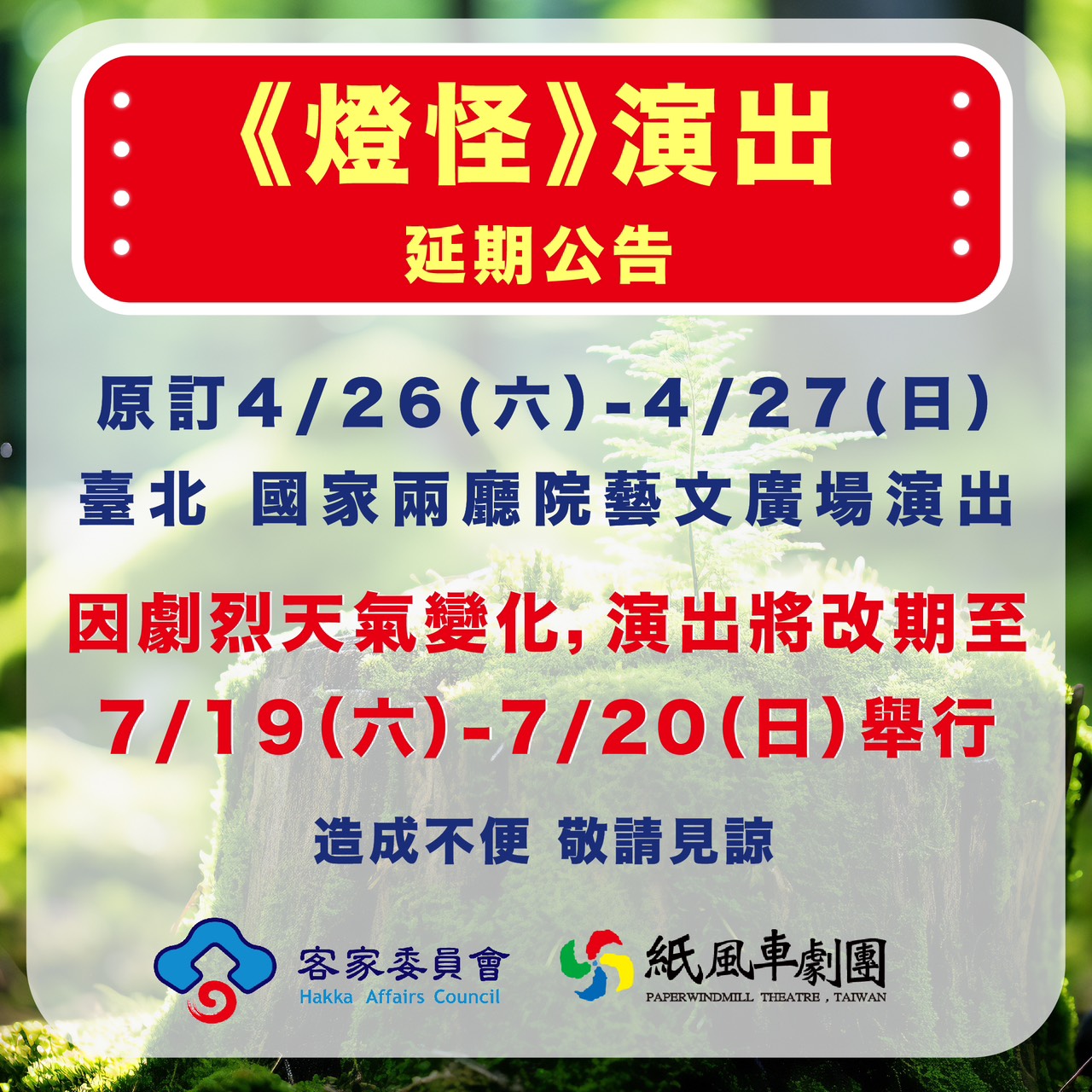 原訂4/26(六)和4/27(日)《燈怪》演出將延期至7/19(六)-7/20(日)臺北兩廳院藝文廣場舉辦期盼大家的理解與支持,也感謝大家的包容。《燈怪》家族與大家相約七月見。