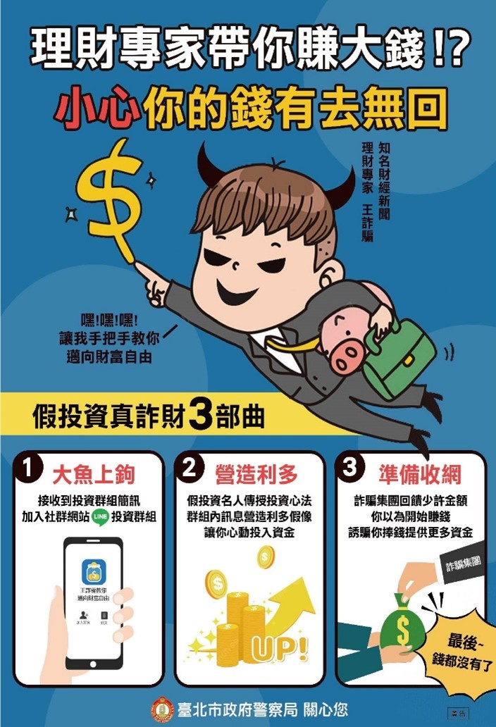 警惕假冒各種投資詐騙!勿輕信假冒「抽股票」或「理財老師」要求,保持要存疑、要確定及要連繫,避免掉入陷阱,遭人受騙。