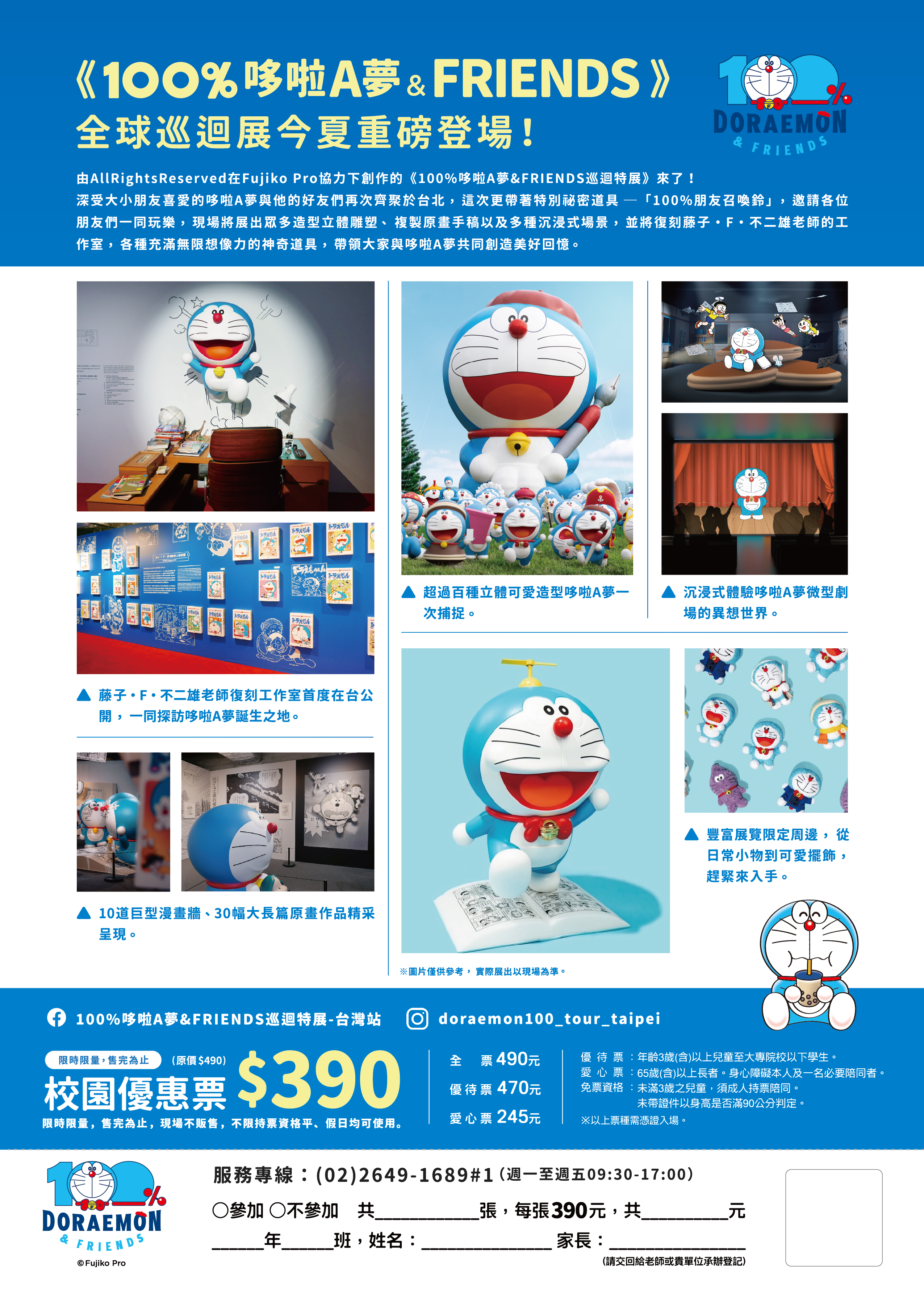 《100%哆啦A夢&FRIENDS》全球巡迴展今夏登台!深受大小朋友喜愛的哆啦A夢與他的好友們再次齊聚於台北,這次更帶著特別祕密道具─「100%朋友召喚鈴」,邀請各位朋友們一同玩樂,現場將展出眾多造型立體雕塑、複製原畫手稿以及多種沉浸式場景,還將重現藤子・F・不二雄老師的工作室,以及各種充滿無限想像力的神奇道具,帶領大家與哆啦A夢共同來創造許多美好回憶。