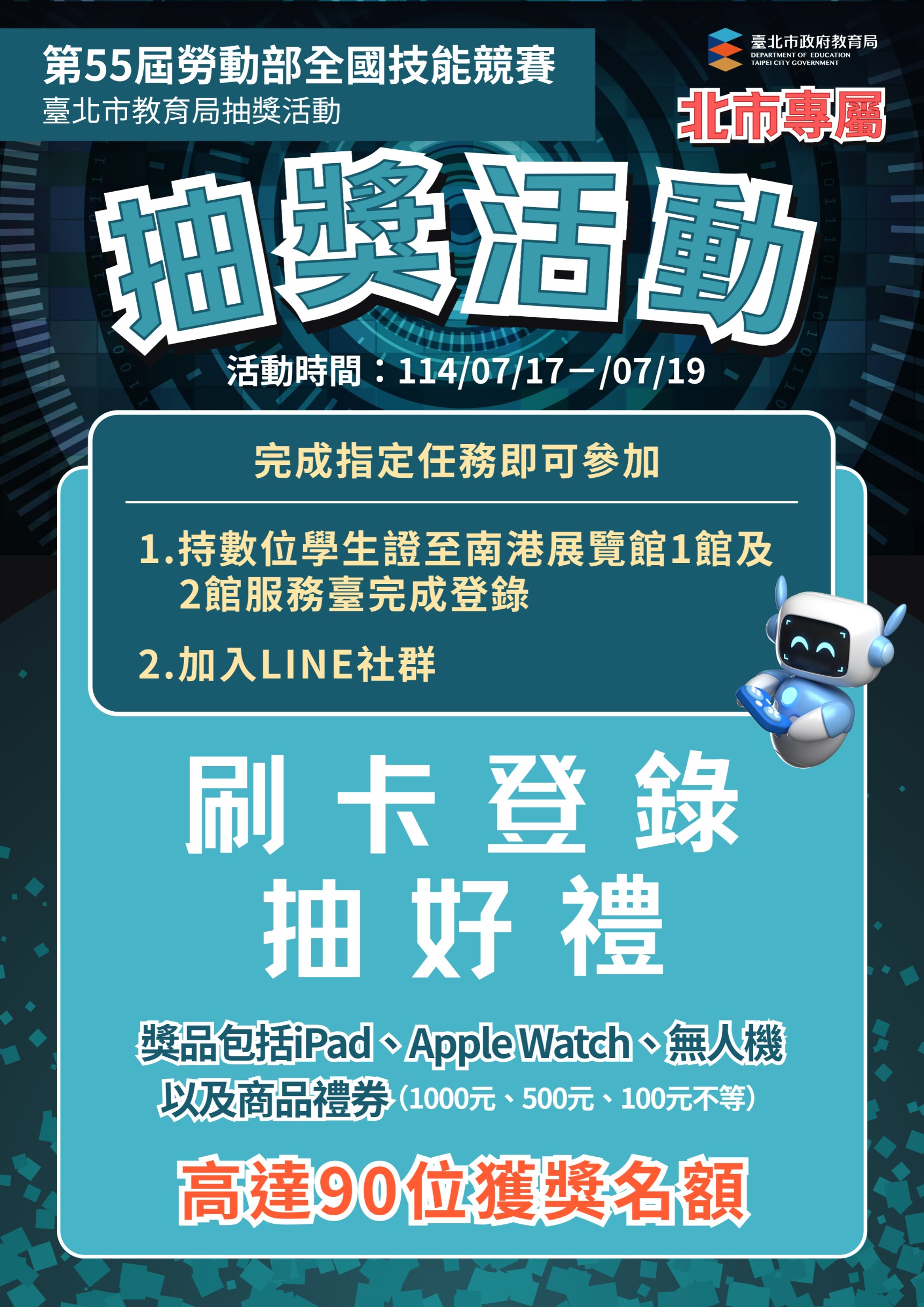 競賽活動訂於114年7月17日(星期四)至7月19日(星期六)假臺北市南港展覽館1、2館(臺北市南港區經貿二路1、2 號)舉行,本次辦理青年組56職類與青少年組13職類,共計69職類,為年度技職教育盛事。