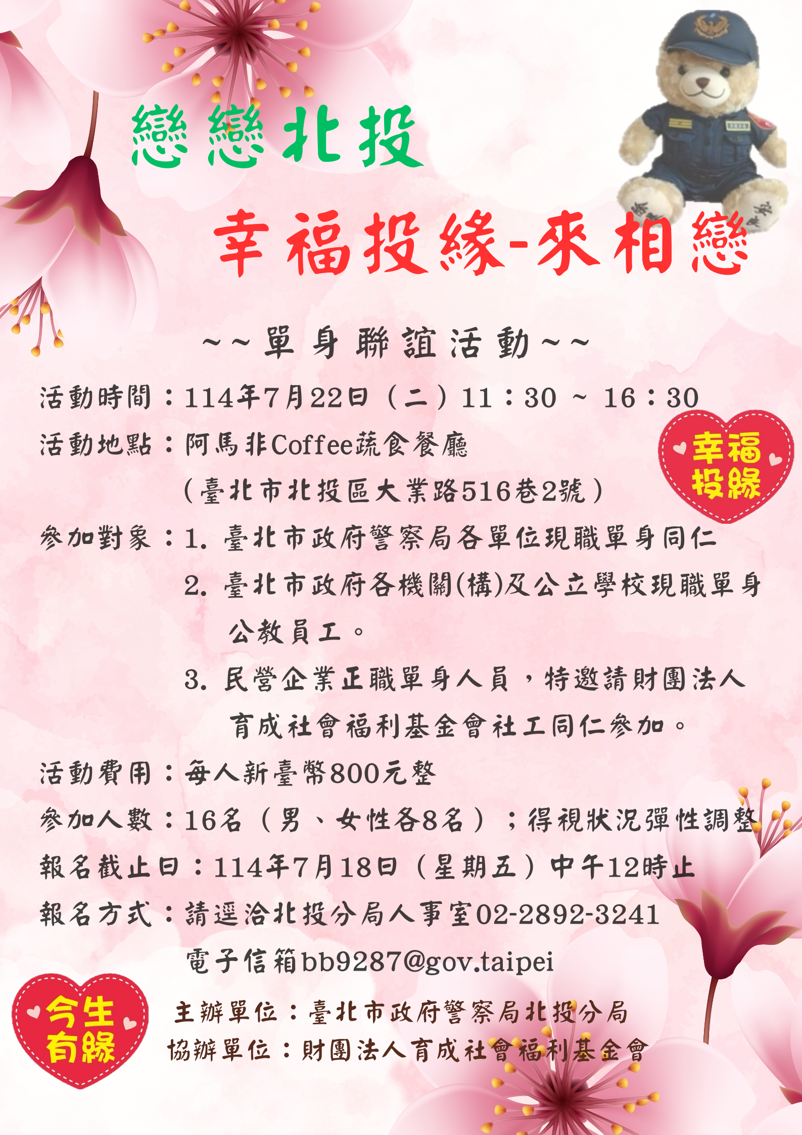 主旨:有關本分局主辦114年度「戀戀北投‧幸福投緣—來相戀」單身派對聯誼活動,請惠予協助宣傳並鼓勵單身同仁踴躍參加,請查照。說
