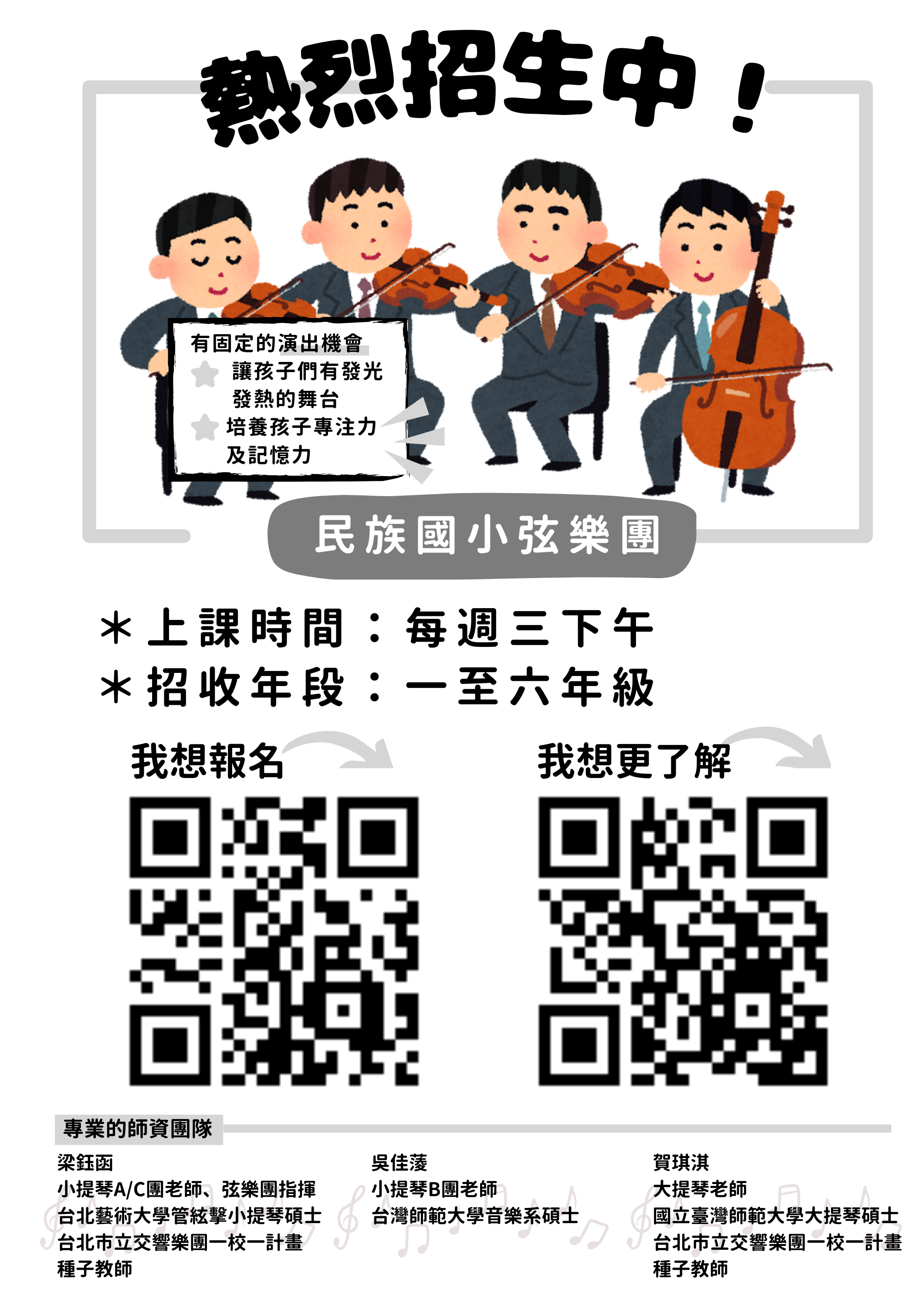 想了解更多弦樂團的資訊,請點選連結:https://sites.google.com/mces.tp.edu.tw/mcesstringorchestra/%E9%A6%96%E9%A0%81