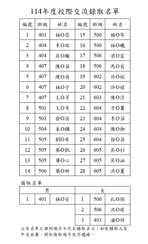 恭喜以下錄取校際交流之同學,相關訊息會另行發通知給各位孩子。