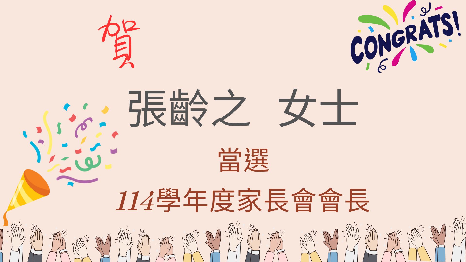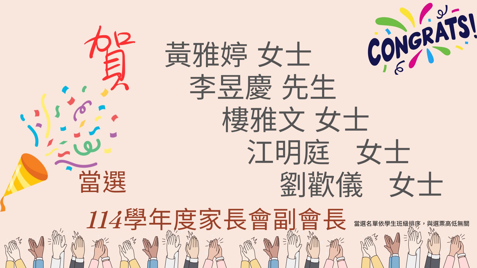 恭喜張齡之女士當選本屆家長會會長,黃雅婷 女士、 李昱慶 先生、 樓雅文女士、 江明庭 女士、 劉歡儀 女士當選副會長!!