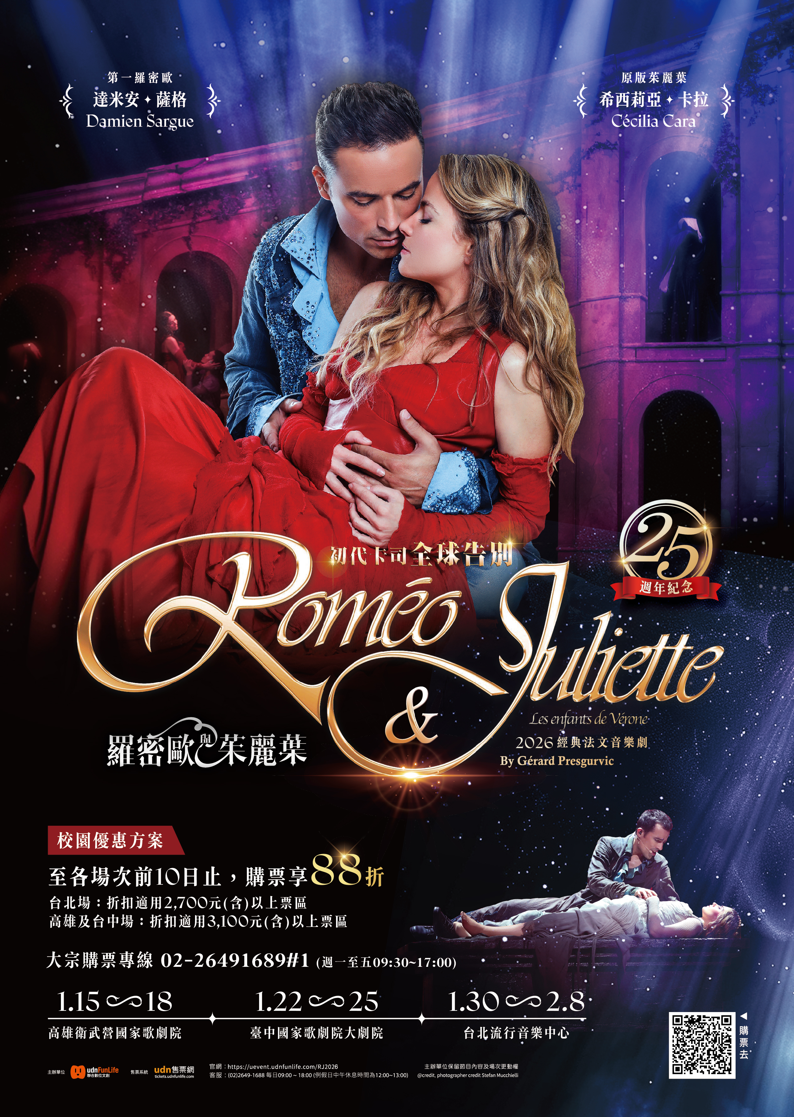 經典法文音樂劇《羅密歐與茱麗葉》自2001年在巴黎首演 即轟動全球,以磅礴動人的音樂、現代感十足的編舞與都 市巴洛克風格美學,重新詮釋莎士比亞經典悲劇,劇中更 以紅與藍兩大色系象徵家族對峙,展現強烈視覺張力;而 初代卡司的演出早已成為大眾心中難以取代的記憶,本次 適逢音樂劇25周年同時也是初代卡司告別巡演,讓這次在 台灣的演出更具紀念性。法文音樂劇以獨樹一格的「演唱 會」形式製作打造,特別強調「音樂」與「演員魅力」, 以「歌」帶「戲」是法式音樂劇製作的順序與模式,藉由 歌曲詠唱以及雋永詞彙的表達,再加上多樣化背景音樂襯 托,讓演員的情緒起伏及情感傳遞更加深刻。