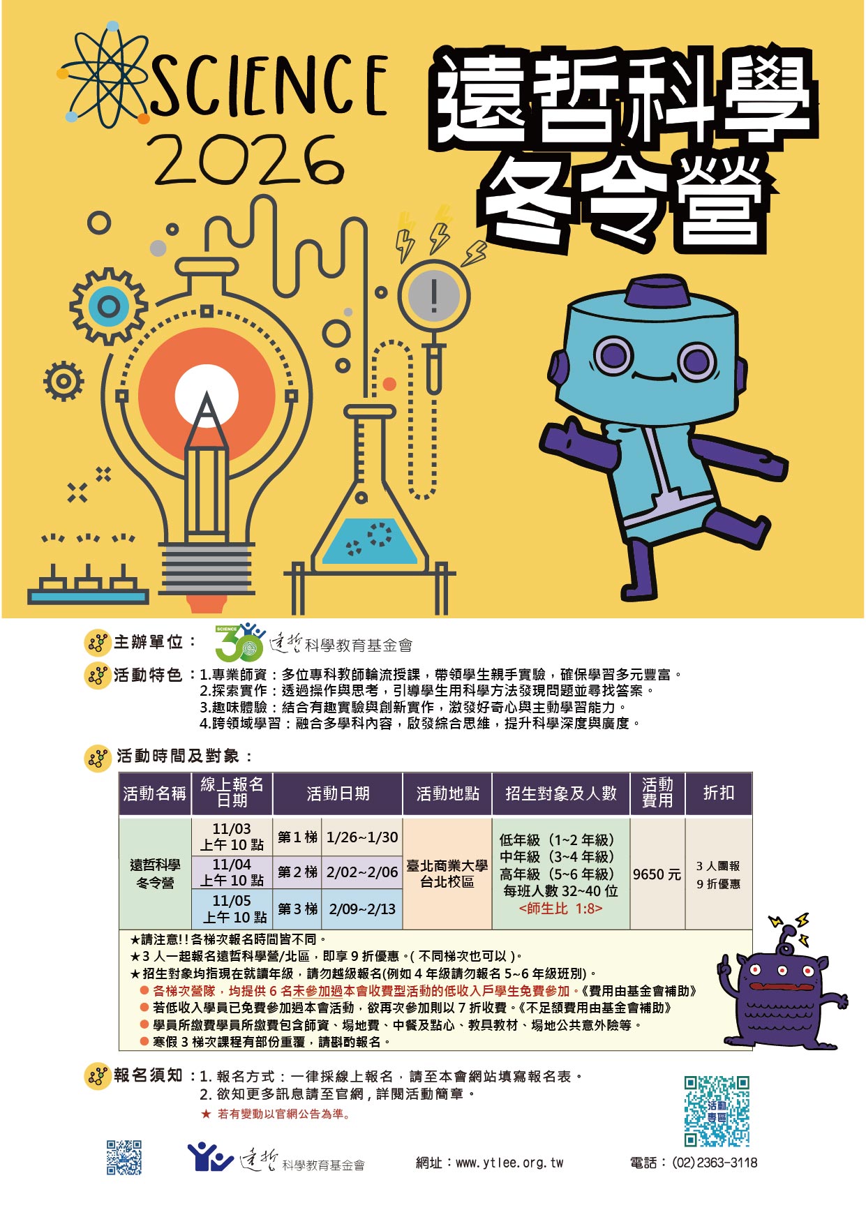 二、活動訂於民國115年1月26日至2月13日,假國立臺北商業大學舉辦三個梯次之遠哲科學冬令營。