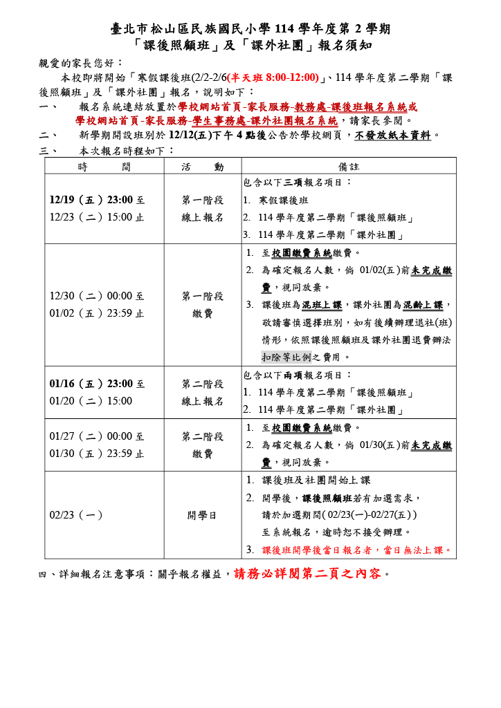 本校即將開始「寒假課照班(2/2~2/6)(半天班08:00-12:00)」、114學年度第二學期「課後照顧班」及「課外社團」報名,