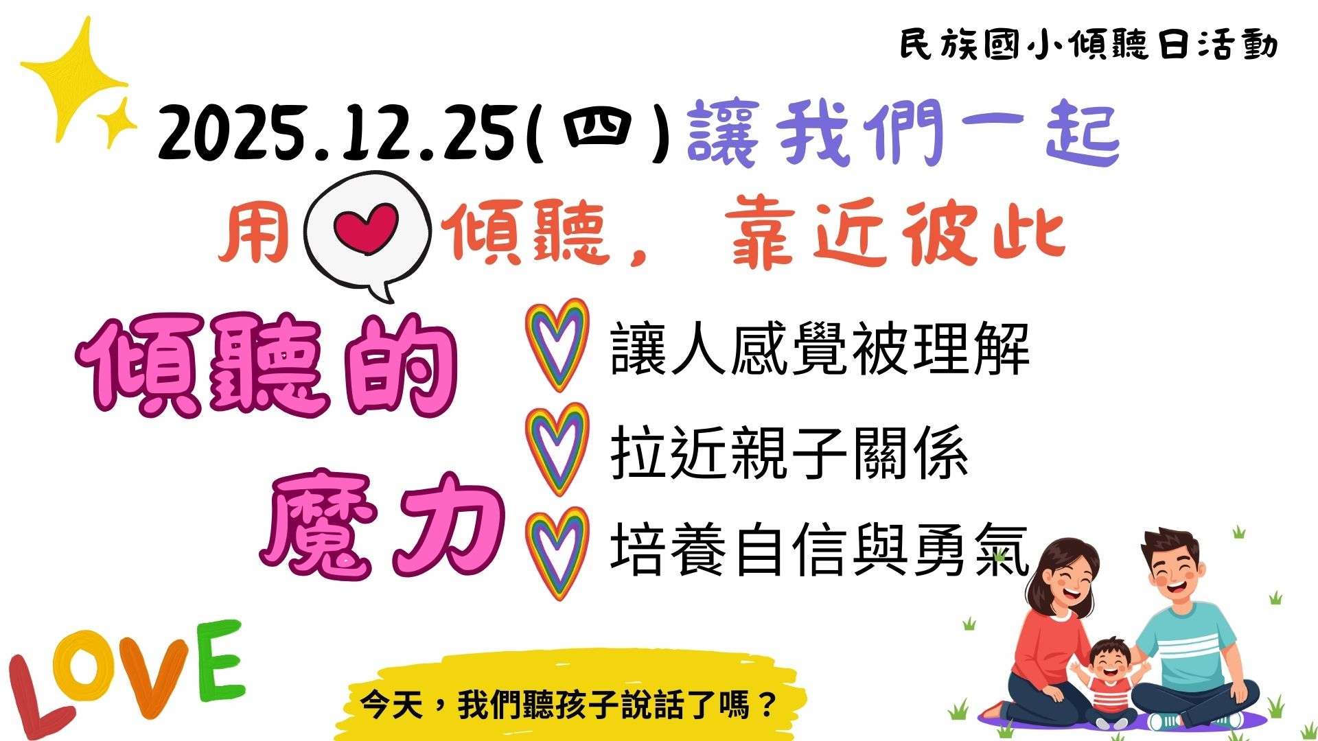 二、為有效推動家庭「傾聽日」,本校於114學年度第一學期訂定12月25日為「傾聽日」,鼓勵家長傾聽孩子的想法,建立親子良好互動。
