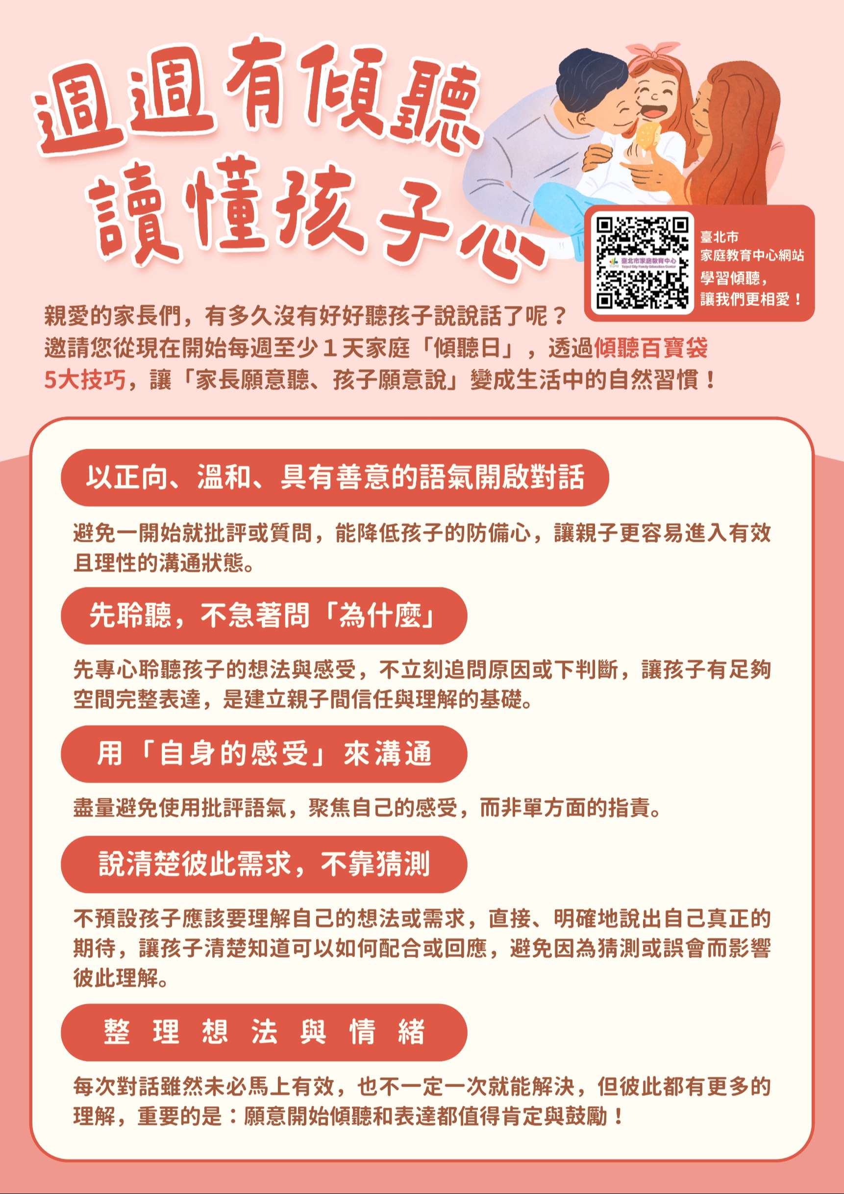 一、為打造「家長願意聽,孩子願意說」的環境,鼓勵所有家長每週至少撥出一天為家庭「傾聽日」,暫時放下手邊的忙碌,專心聽孩子內心的聲音,透過「傾聽百寶袋」5大技巧和「傾聽6部曲」,協助家長有效實踐傾聽,促進親子間雙向溝通與情感交流。