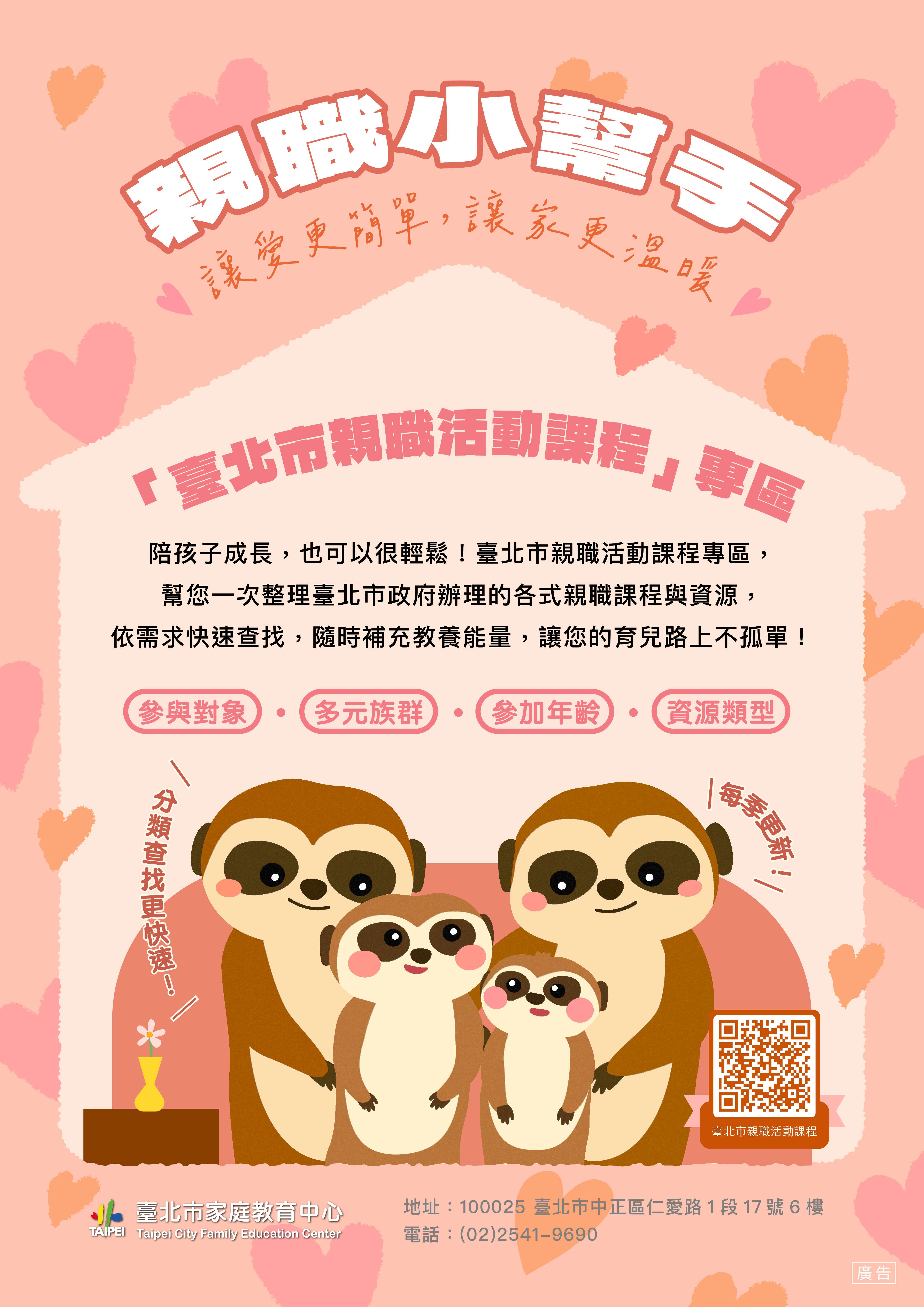 為協助家長掌握親職教育資源,臺北市家庭教育中心設置「臺北市親職活動課程專區」,每季更新臺北市政府辦理之親職課程與活動,並依參與對象與資源類型等分類,歡迎家長掃描QR Code查詢