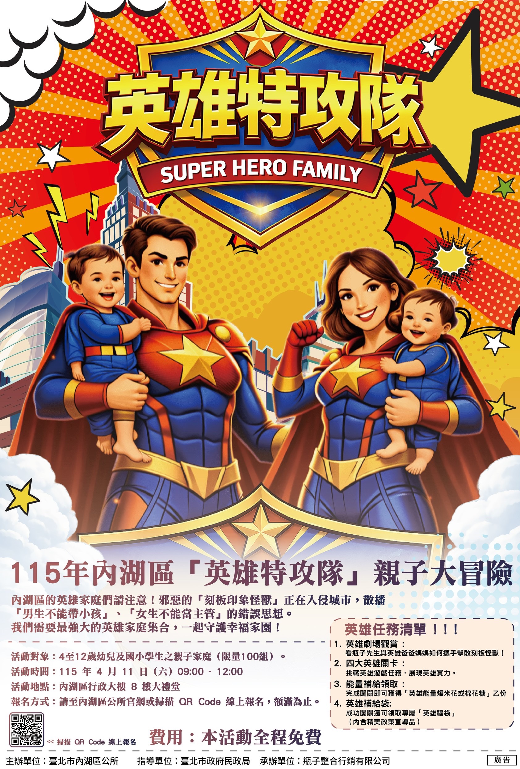 :內湖英雄特攻隊徵召中!115年4月11日一起擊敗刻板印象怪獸。活動包含魔術劇場、英雄闖關摸彩及限量能量補給甜點,帶孩子體驗不一樣的英雄特訓!詳情及報名請上內湖區公所官網查詢,手刀報名去!