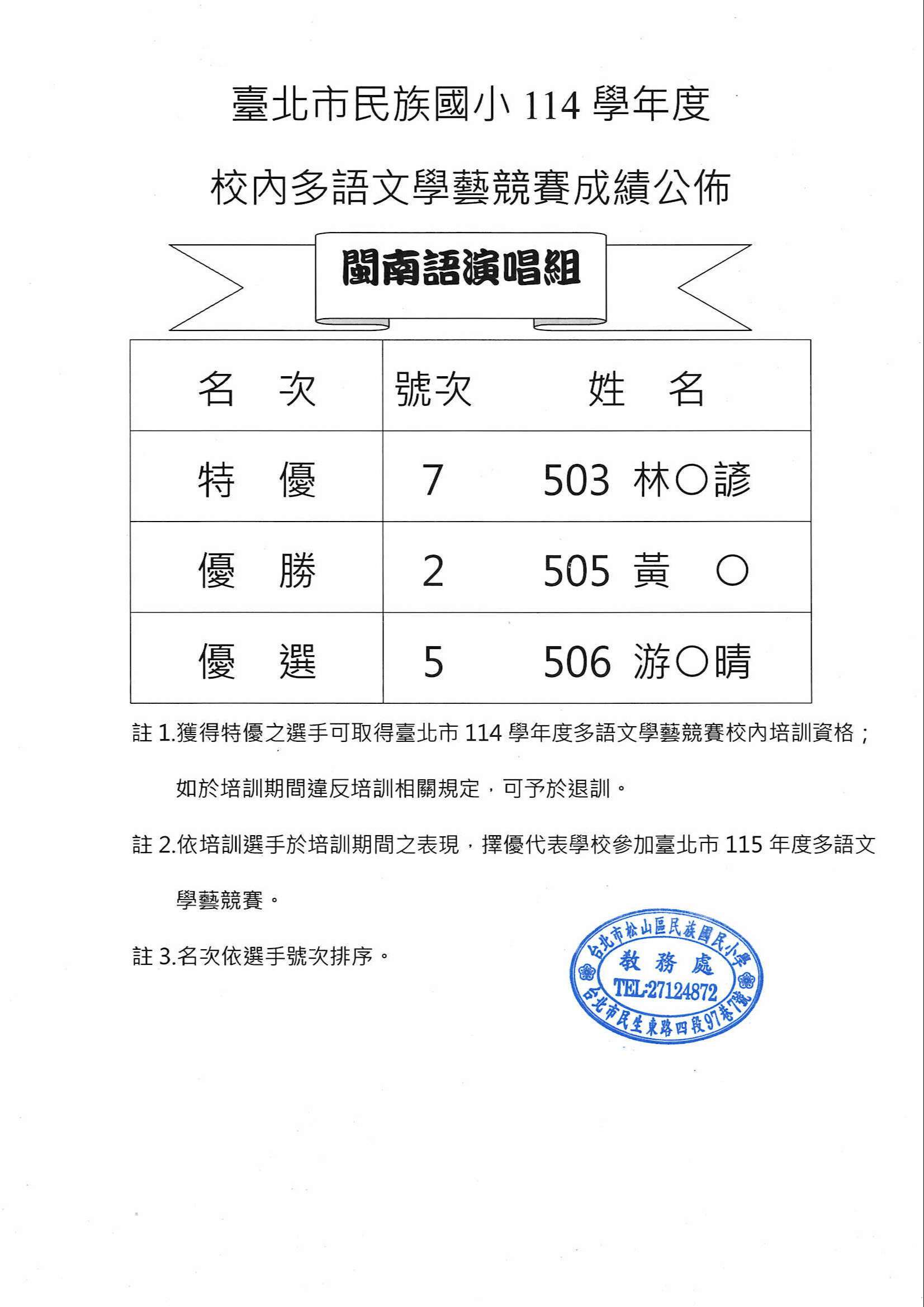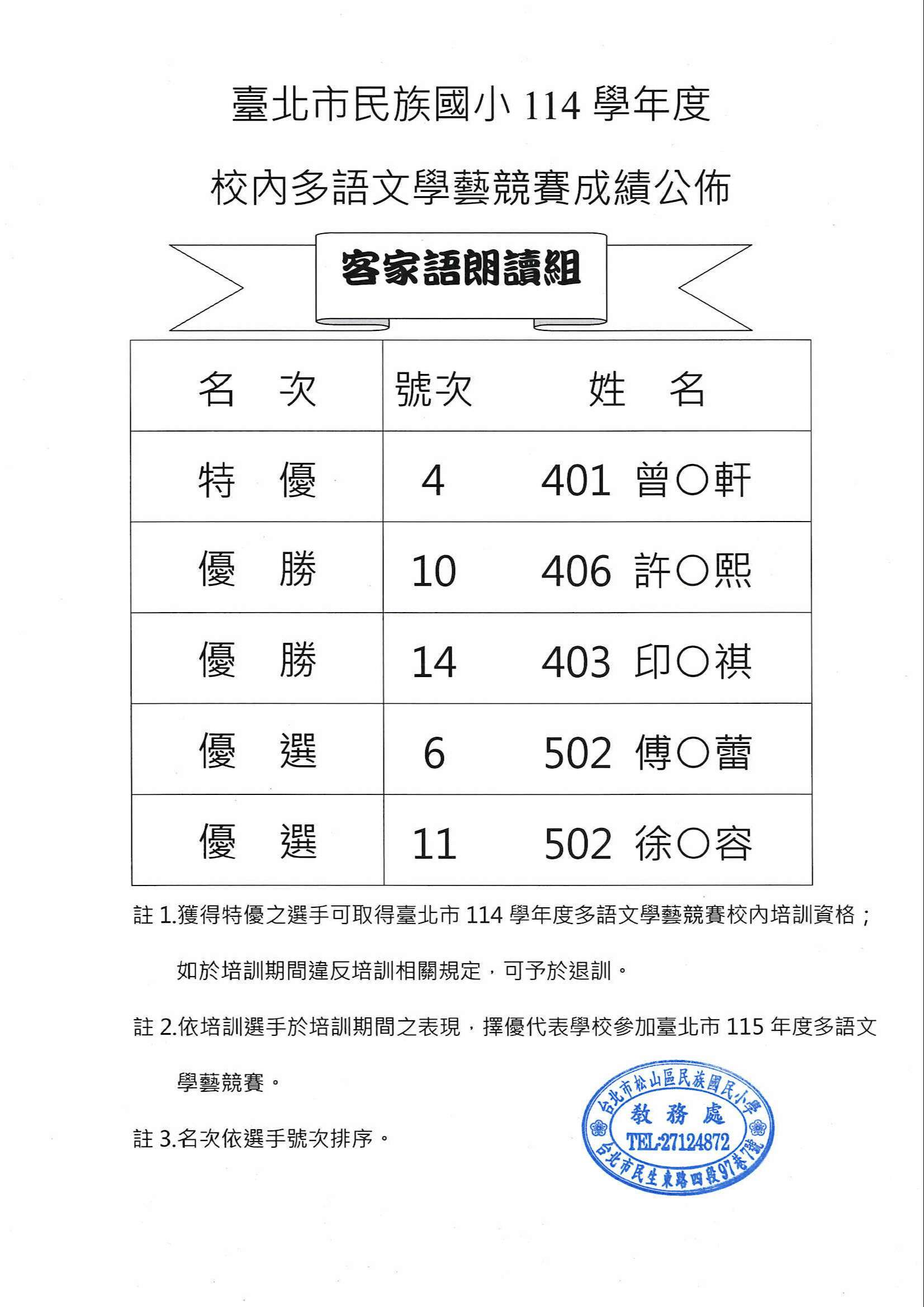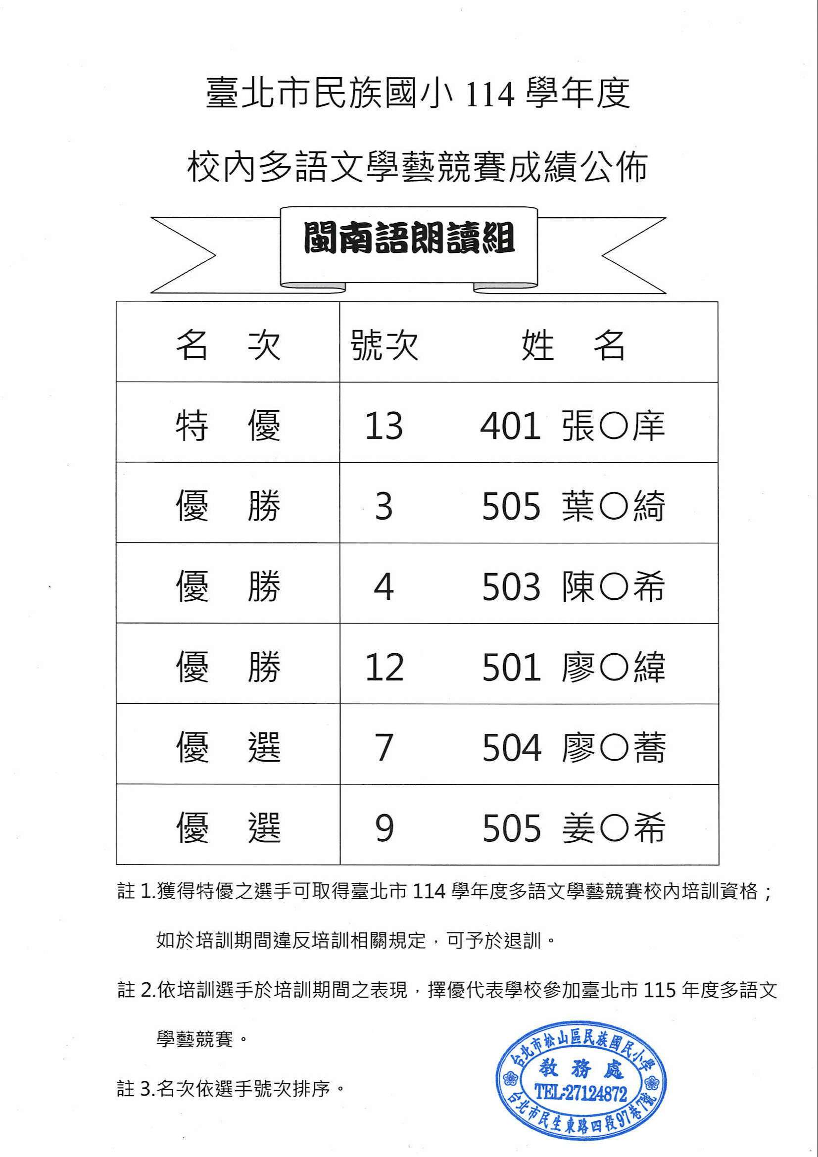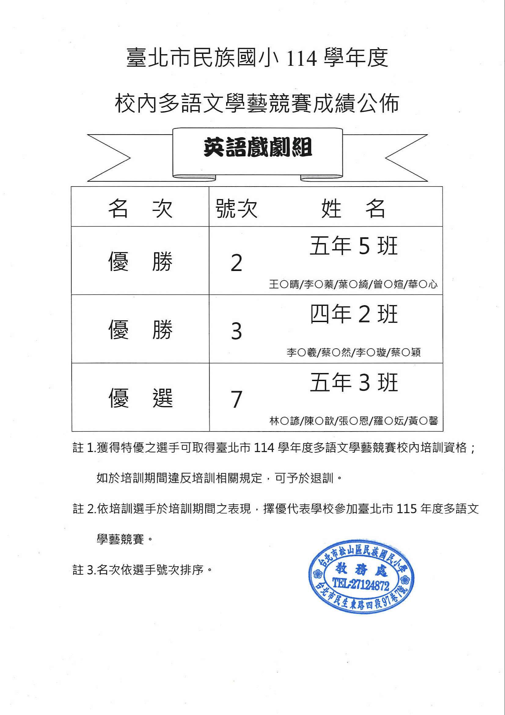 114 學年度 校內多語文競賽 第二階段 賽事成績公告 (姓名遮罩版)