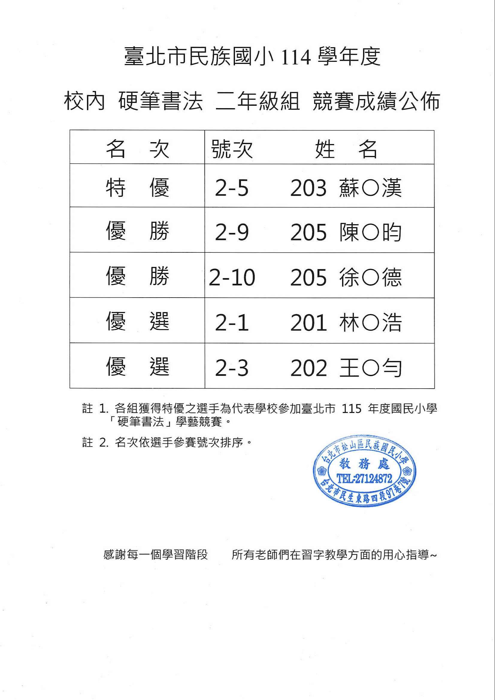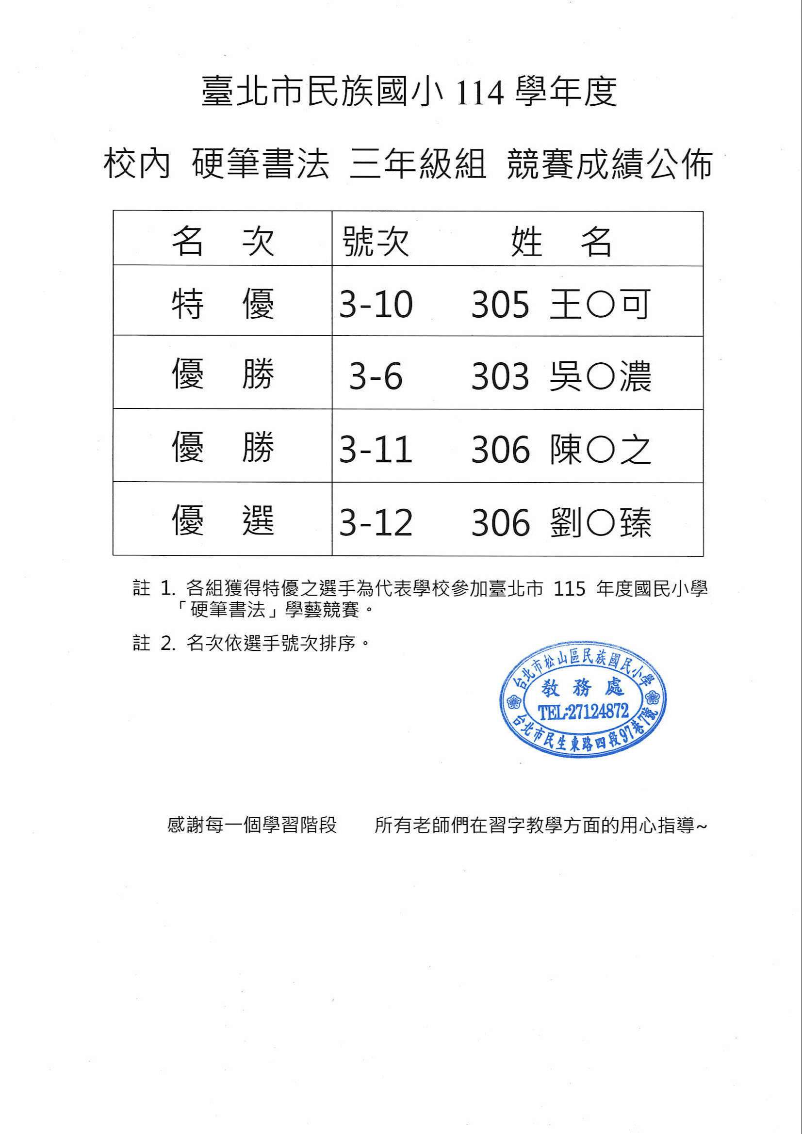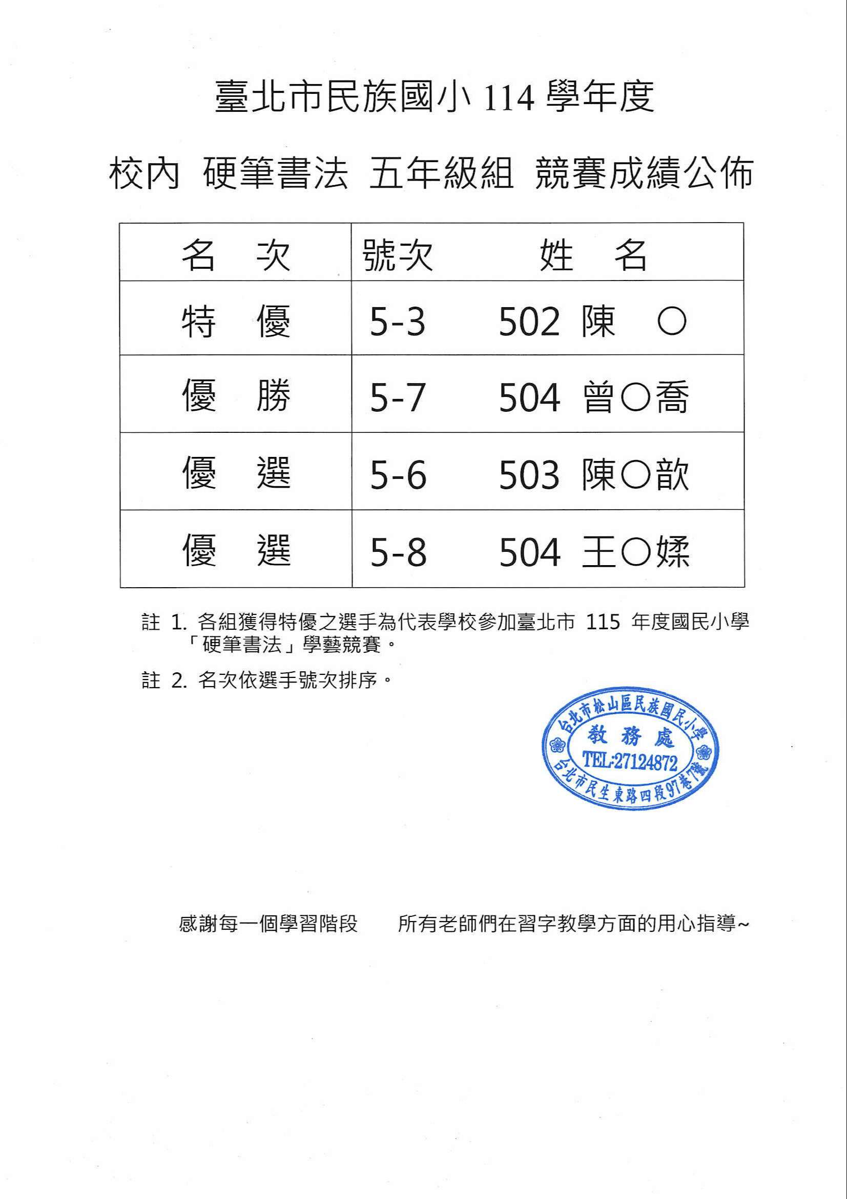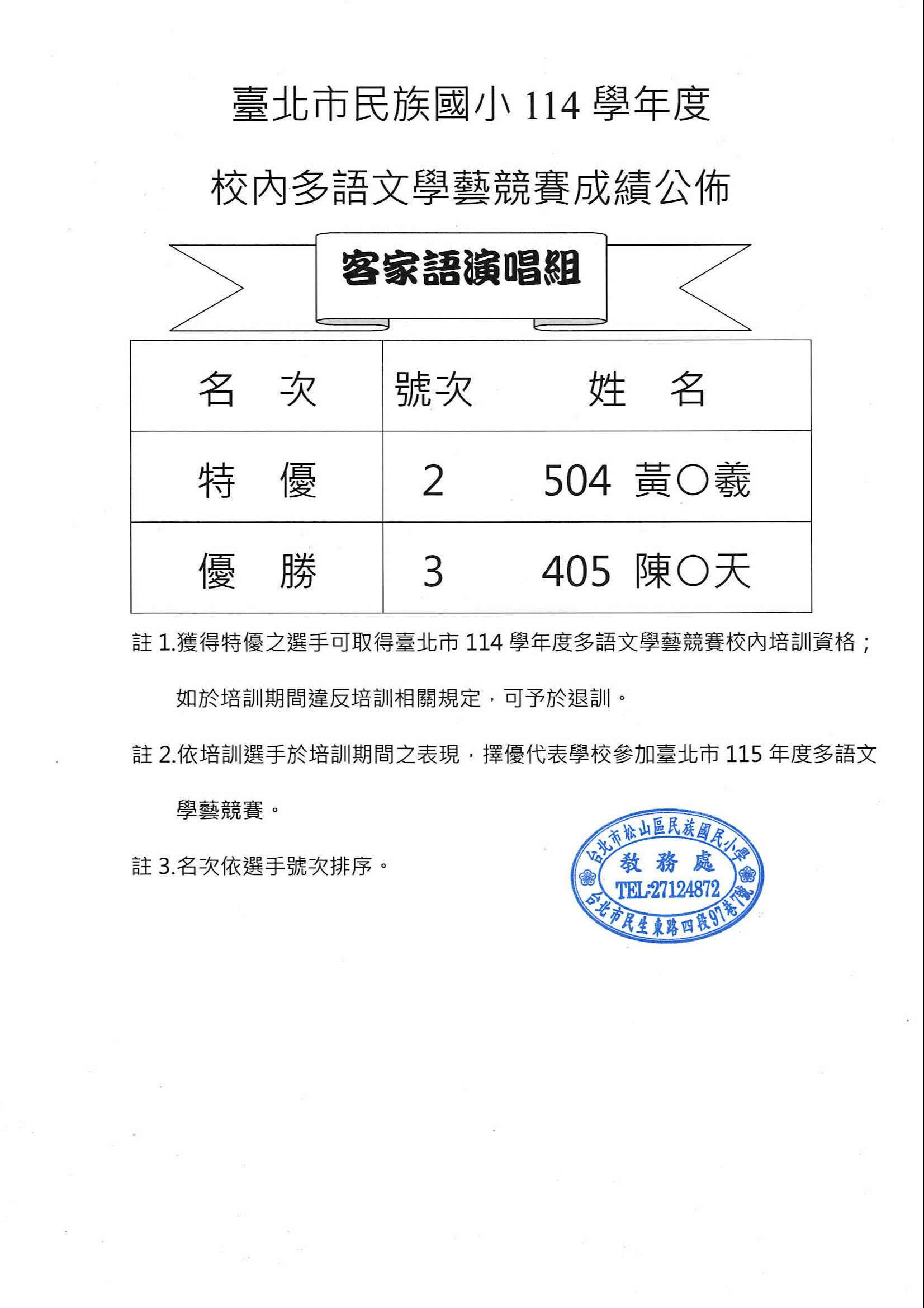 114 學年度 校內多語文競賽 第二階段 賽事成績公告 (姓名遮罩版)