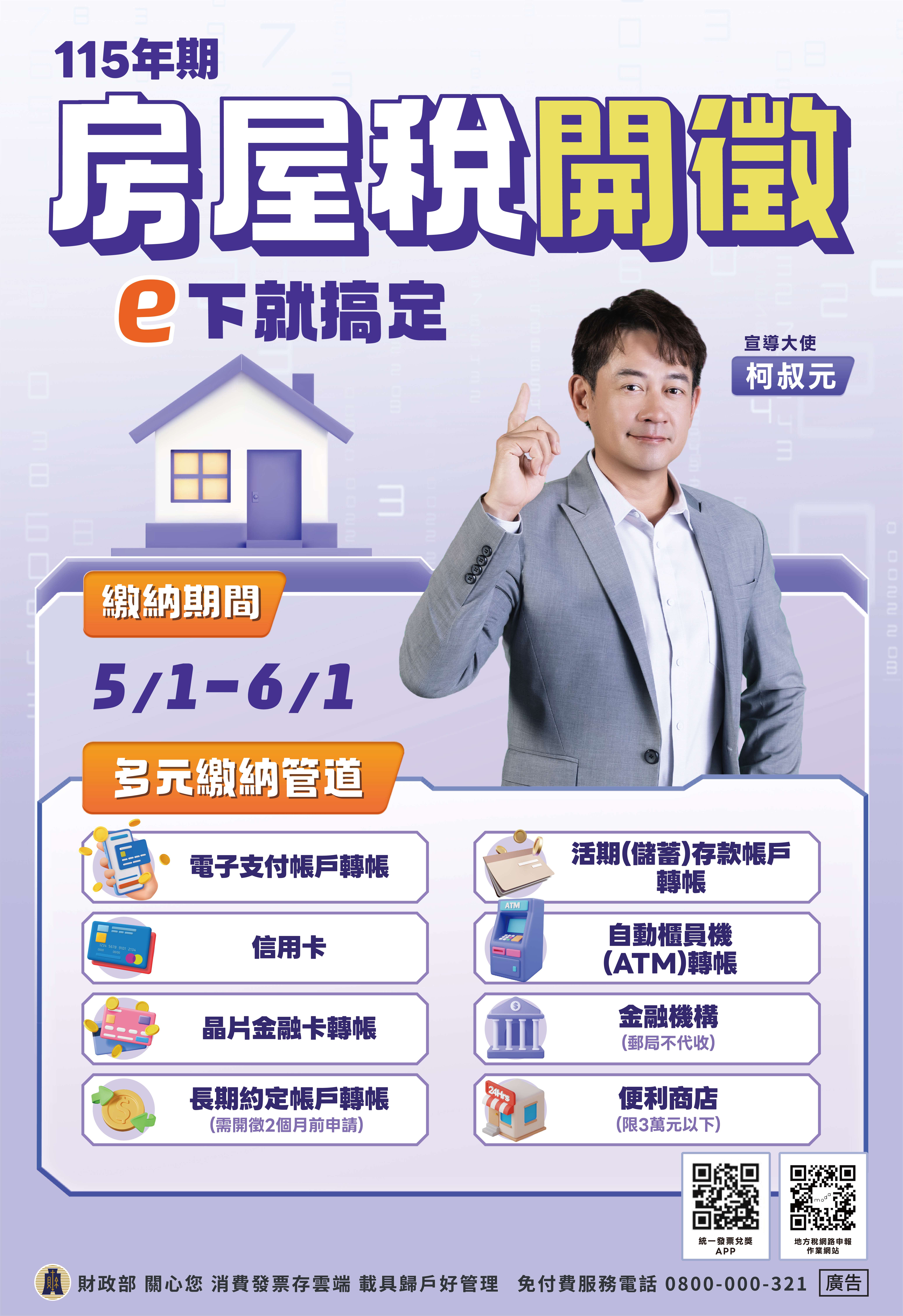 臺北市稅捐稽徵處提醒您,115年房屋稅於115年5月1 日開徵,繳納期限至6月1日,多元繳納管道e下就搞定! 請按時繳納。詳情請見海報說明。